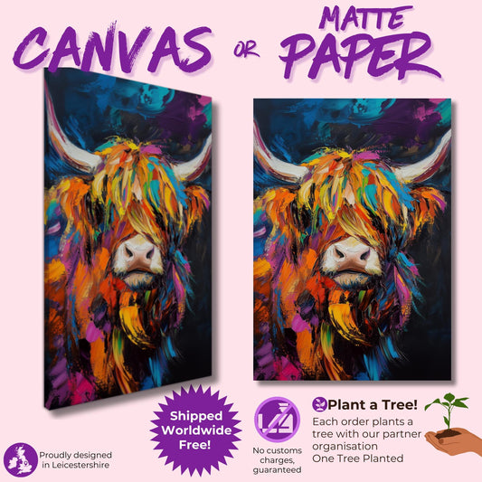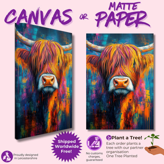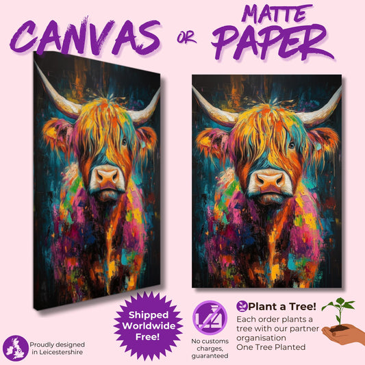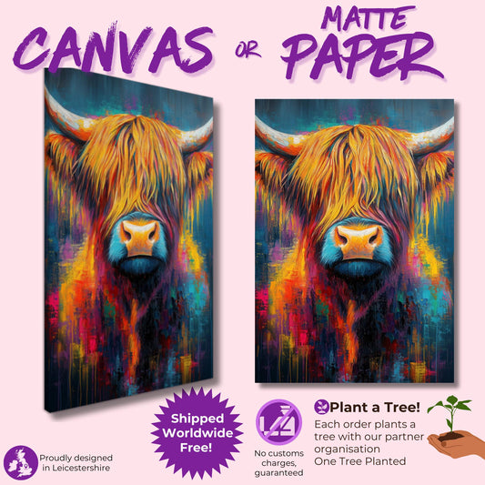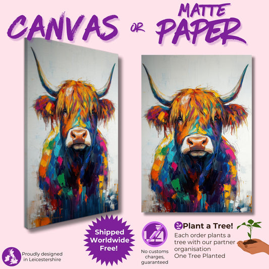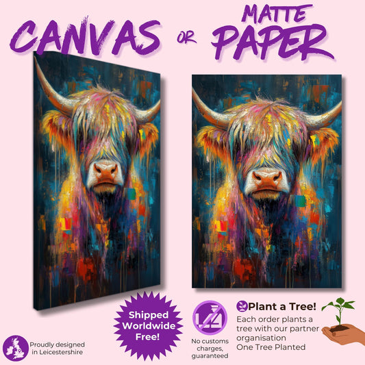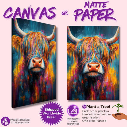 Highland Cow Canvas / Poster Print. Paint Splash Oil Painting Wall Decor Gifts Colourful Scottish Shaggy Cow Painting Farm Animal Farmer - CanvasityCrafts - Free Shipping