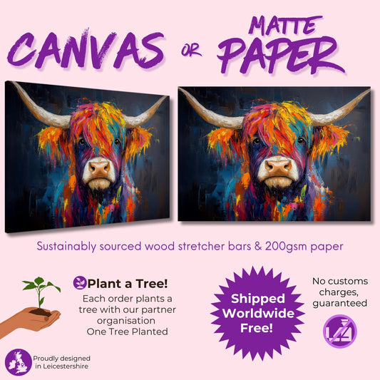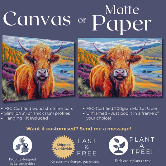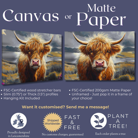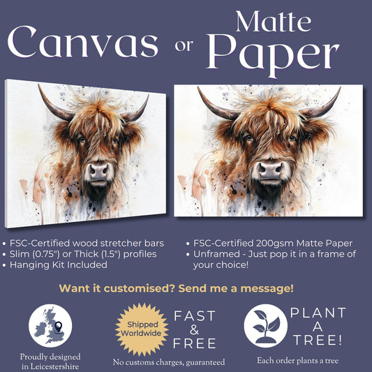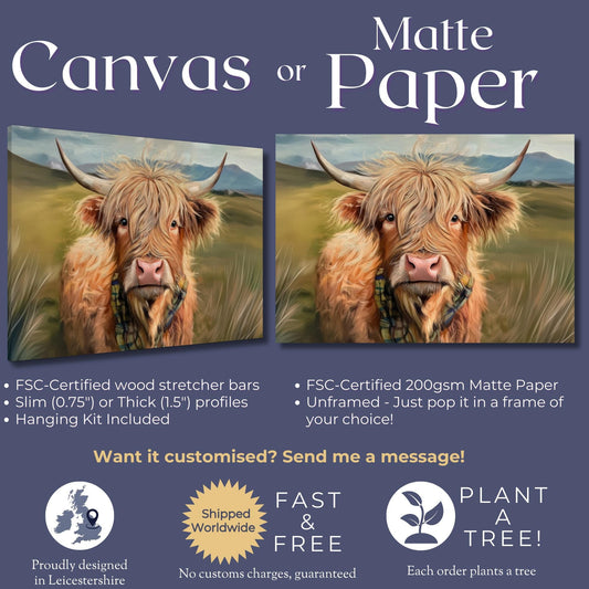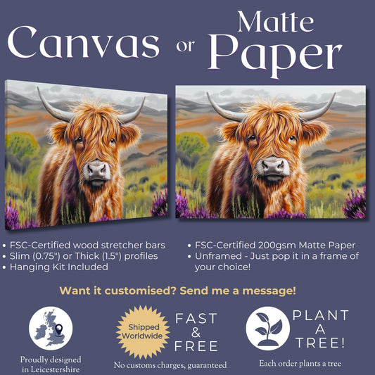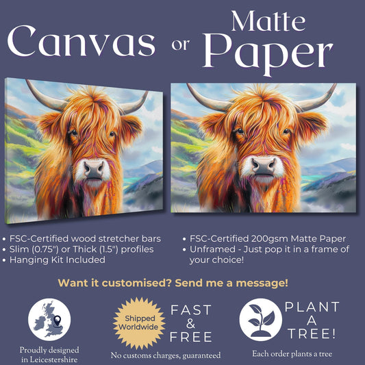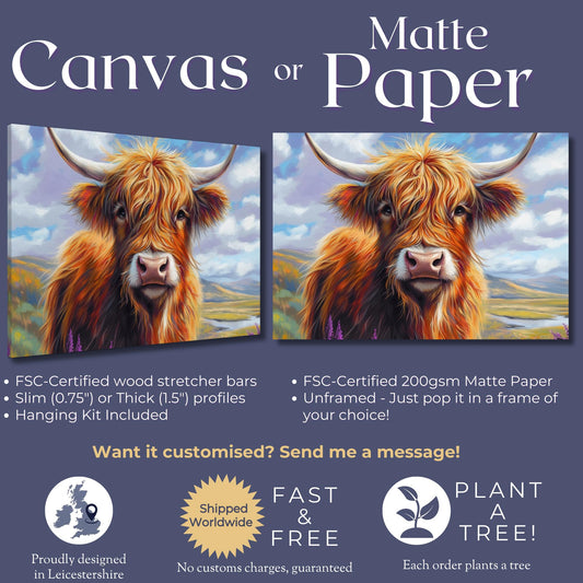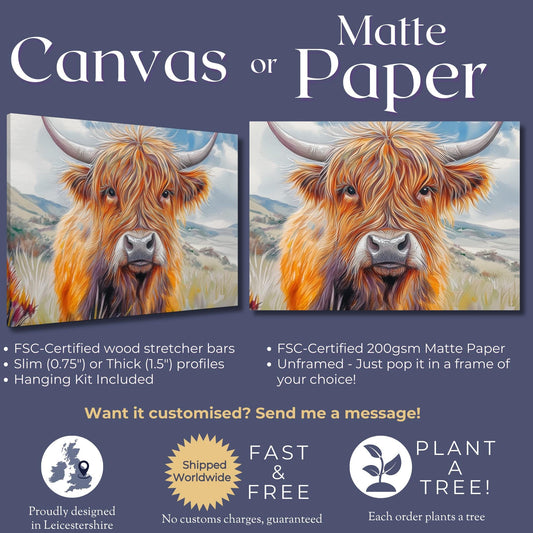 Shop my collection of highland cow paintings available on coated stretched canvas, or 200gsm matte paper (both framed and unframed).