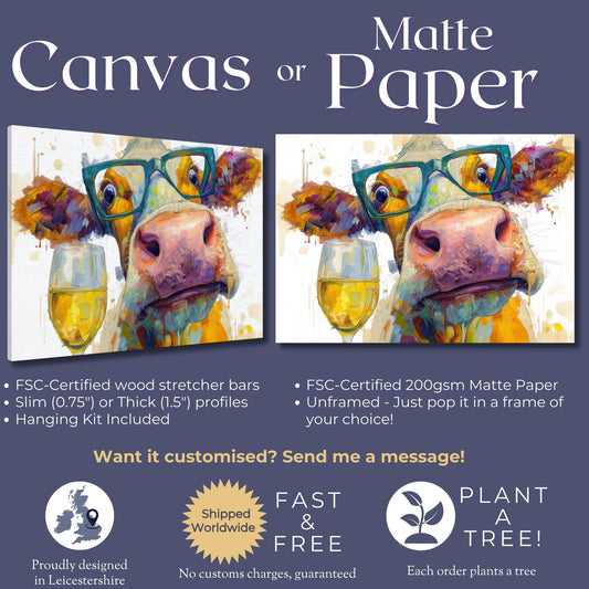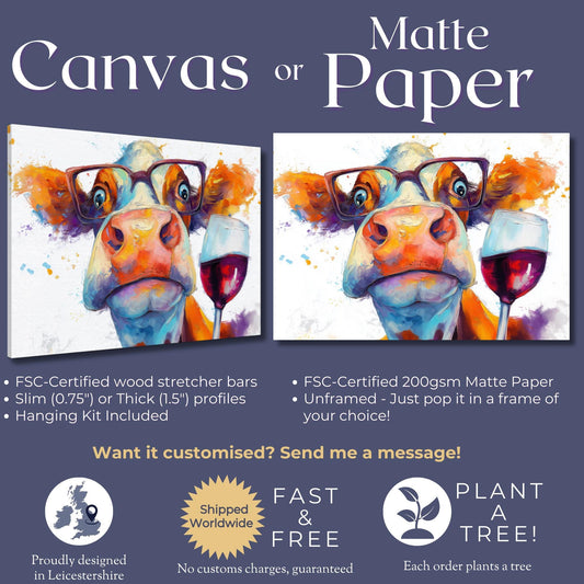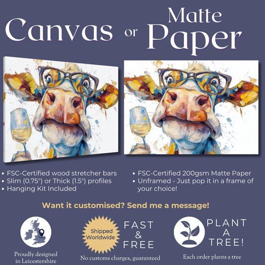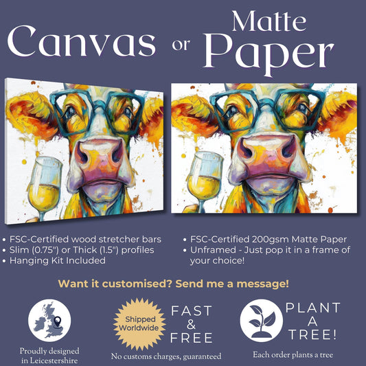 Highland Cow Wearing Glasses Canvas / Poster Print. Watercolour Paint Splash Wall Decor Gift Scottish Shaggy Cow Painting Farm Animal Farmer - CanvasityCrafts - Free Shipping