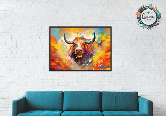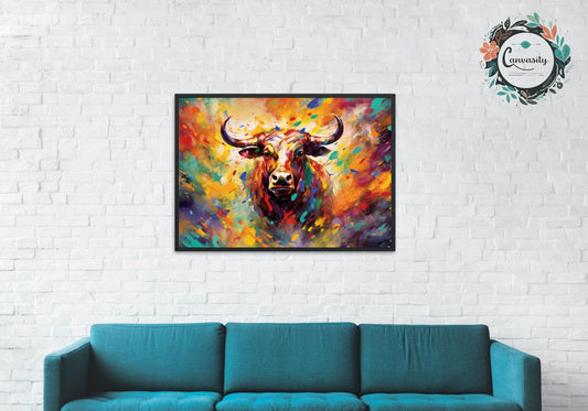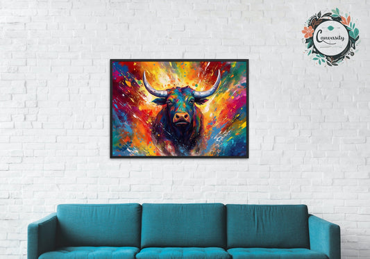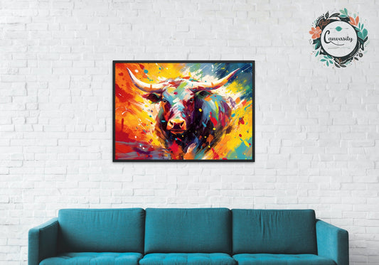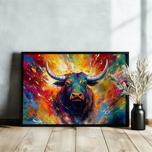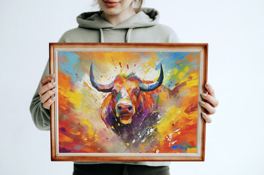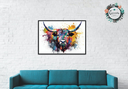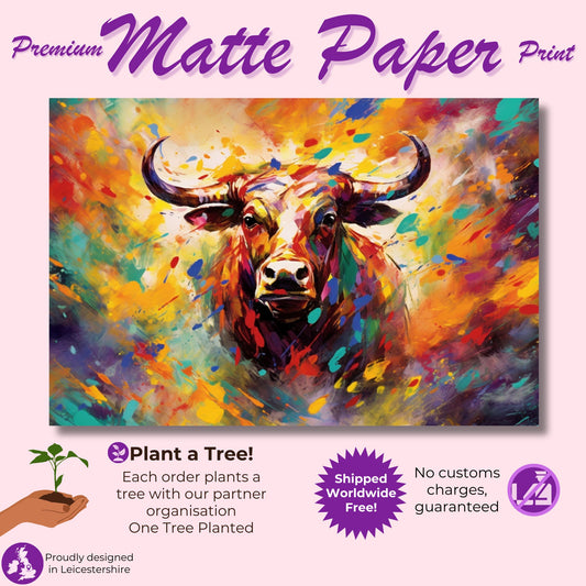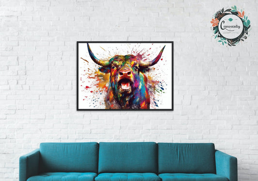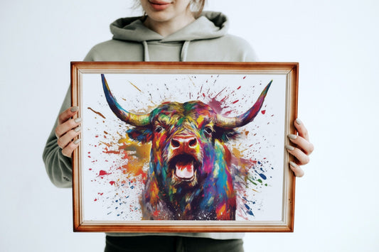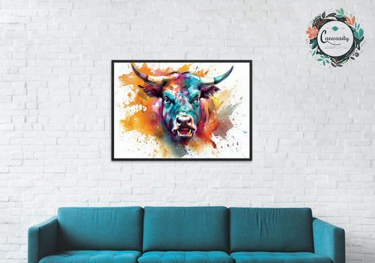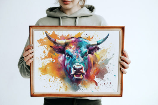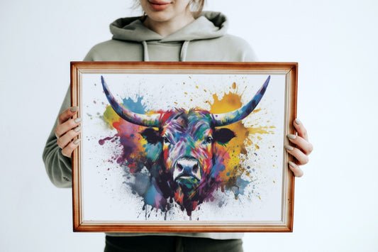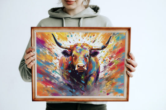 Charging Bull Poster Print. Vibrant Colourful Farm Animal Wall Decor Gift for Farmer, Dad, Grandad, Matador. Farmhouse Art, Paint Splash