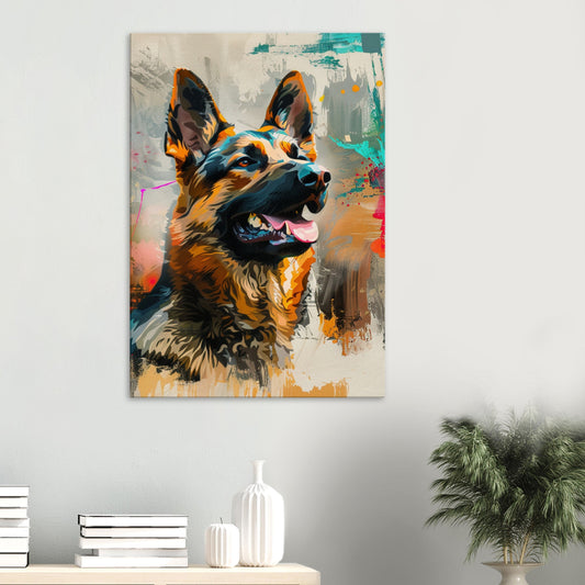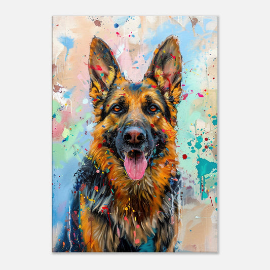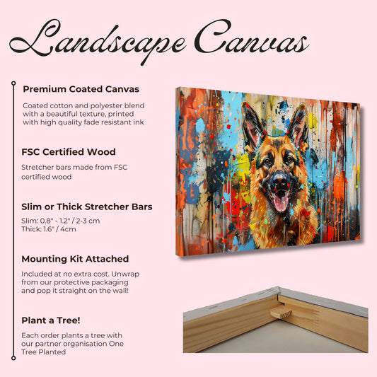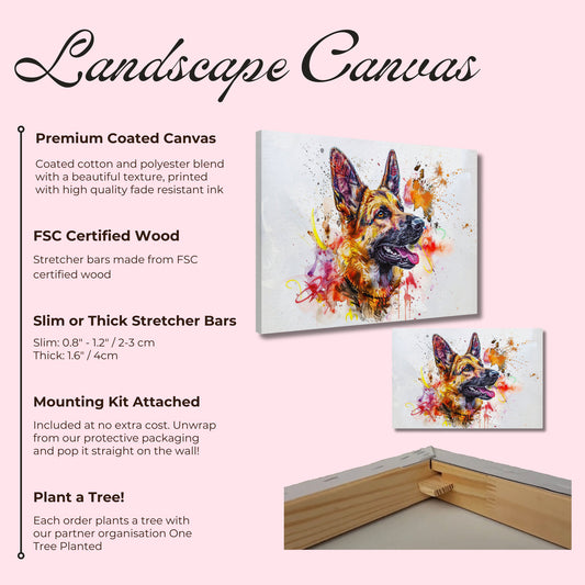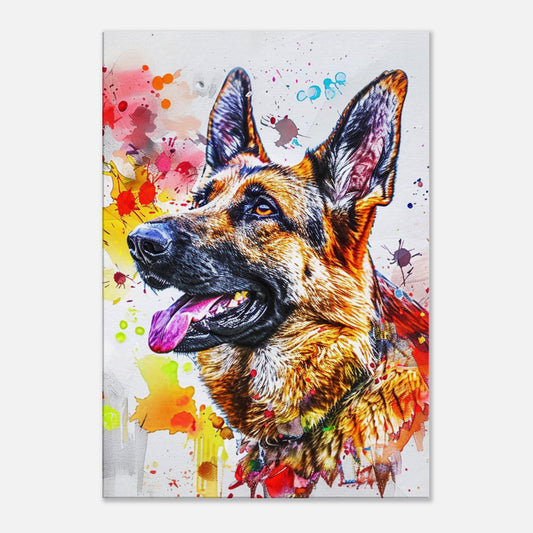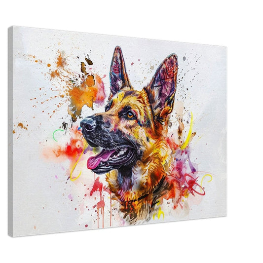 Watercolour German Shepherd Canvas Print Horizontal or Vertical (Landscape / Portrait). Unique Colourful GSD Dog Painting, Paint Splash Gift