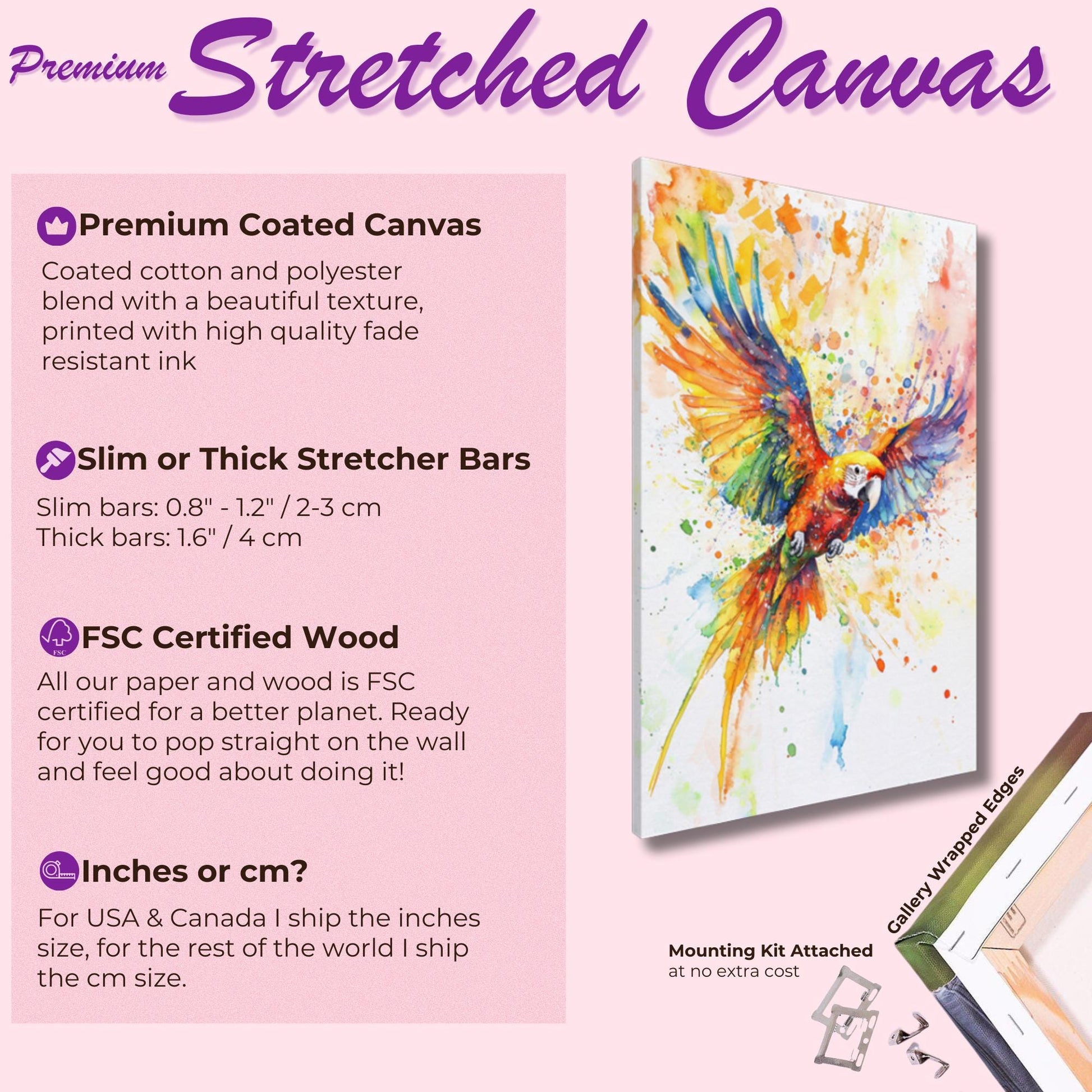 Available on our premium 200gsm uncoated matte paper and printed with high quality ink, this eye-catching parrot portrait will maintain its vibrancy for years to come. Alternatively, order your exotic bird artwork on our ready-to-hang premium coated canvas made from a blend of cotton and polyester fabric - this gives an enhanced texture and timeless beauty that creates a truly immersive art experience, with a weight of approximately 110-130lb cover and a thickness of 350-400 microns for lasting durability! My canvas is available in two thicknesses - slim (about 0.8" / 2cm) and thick (about 1.6" / 3.8cm - 4cm). Both variants come with hanging hardware included for easy installation.