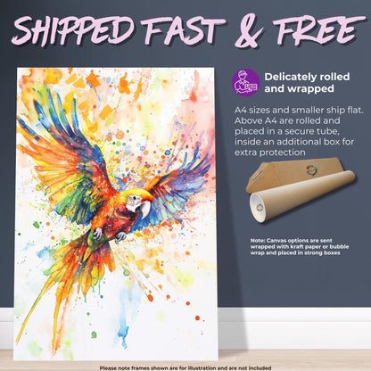 Happy Watercolor Parrot Poster Print - Beautiful Tropical Decor, Colourful Animal Wall Art Painting Gift, Rainbow Watercolour Pop Art