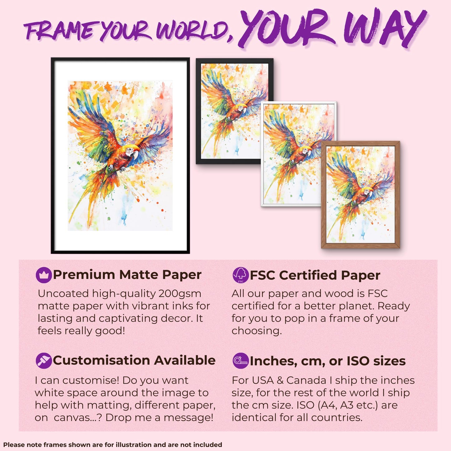 🌟 Various Sizes: Our parrot art comes in various sizes to complement your space, be it square, portrait (vertical), or landscape (horizontal). Can't find the size you need? Drop me a message, and I'll craft it for you!