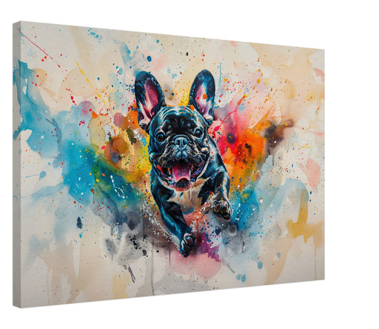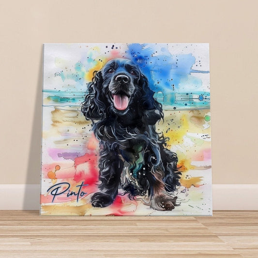 Pinto on the Beach. Colorful Black Cocker Spaniel Pet Memorial Canvas With Splashes of Rainbow Color