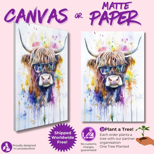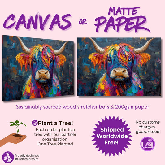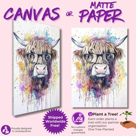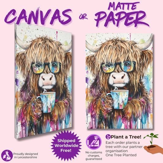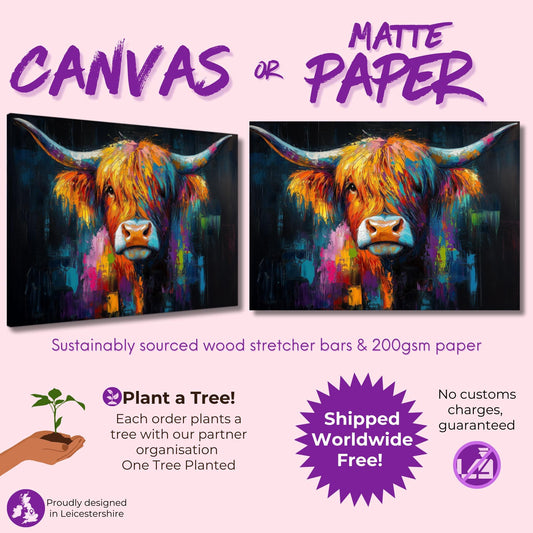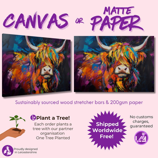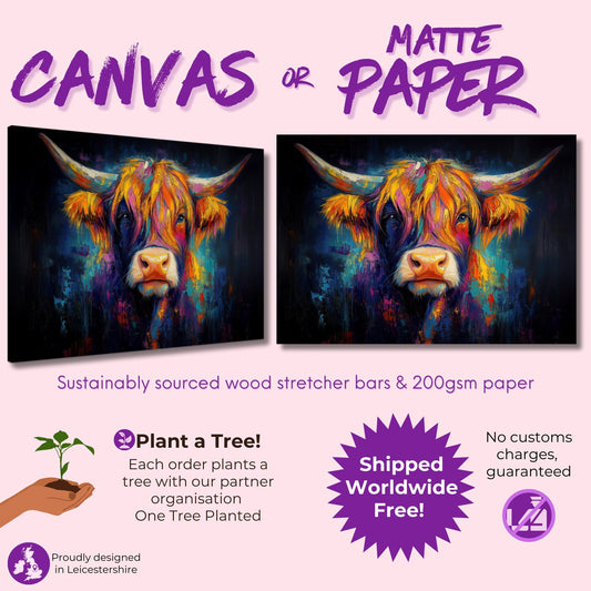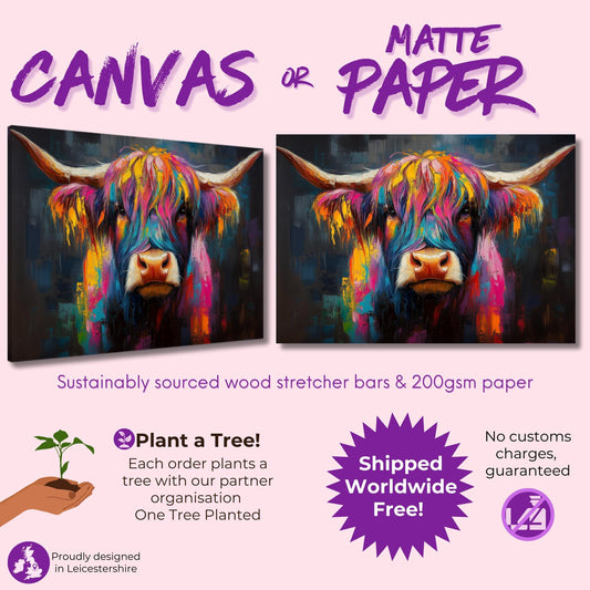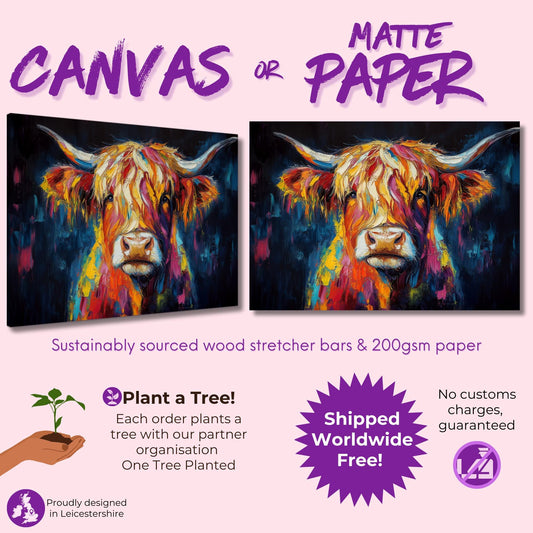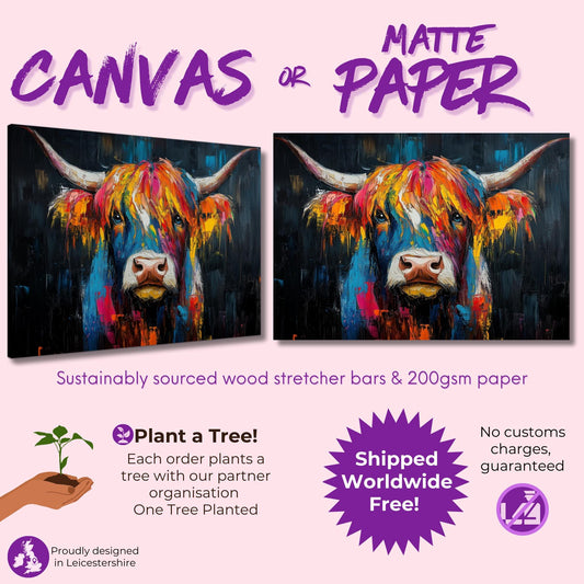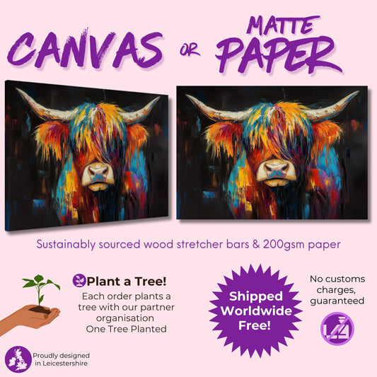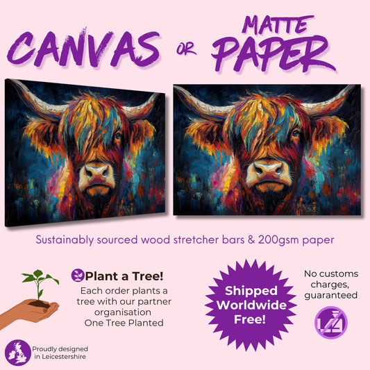 Shop my collection of highland cow paintings available on coated stretched canvas, or 200gsm matte paper (both framed and unframed).