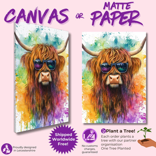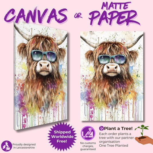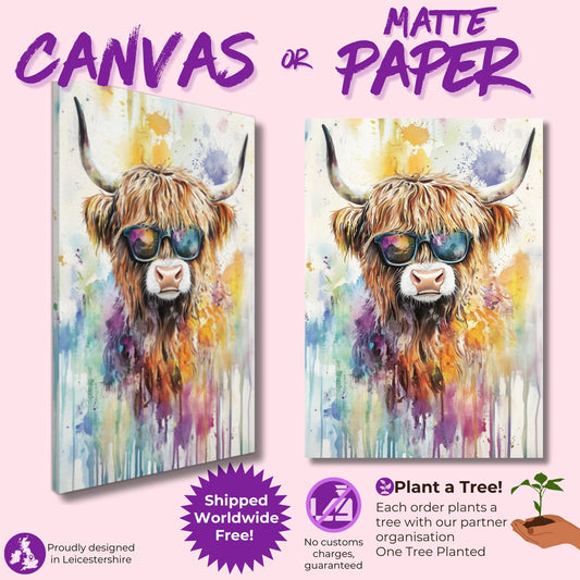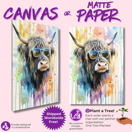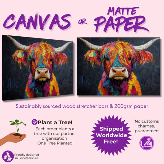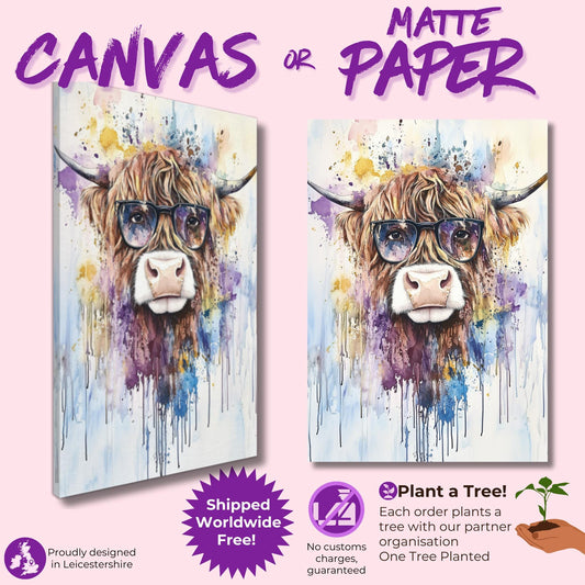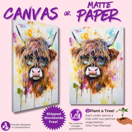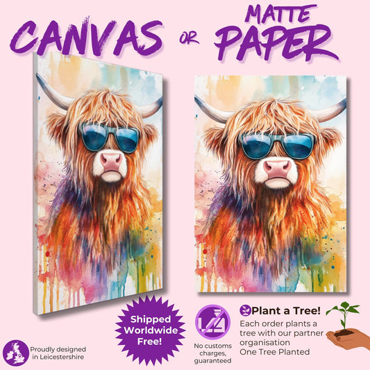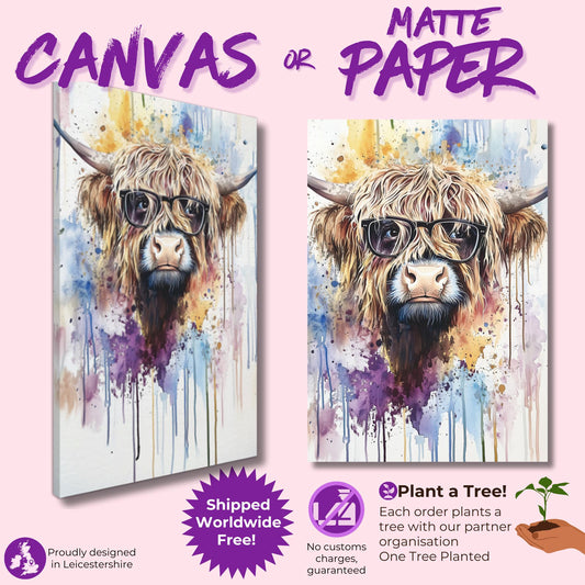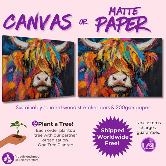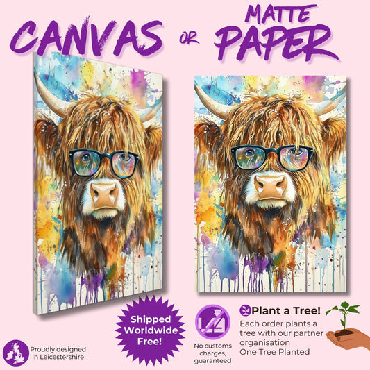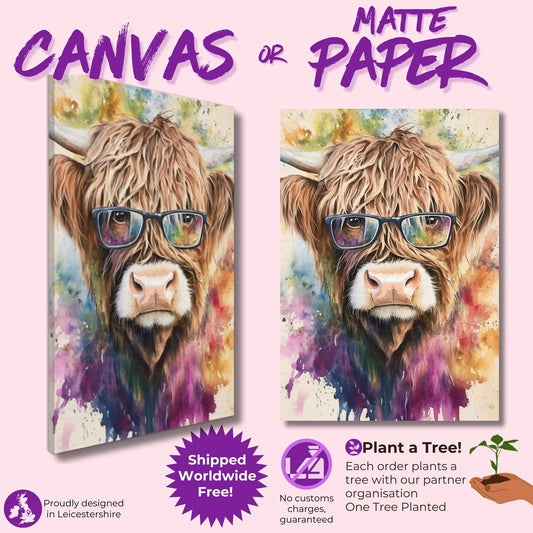 Shop my collection of highland cow paintings available on coated stretched canvas, or 200gsm matte paper (both framed and unframed).