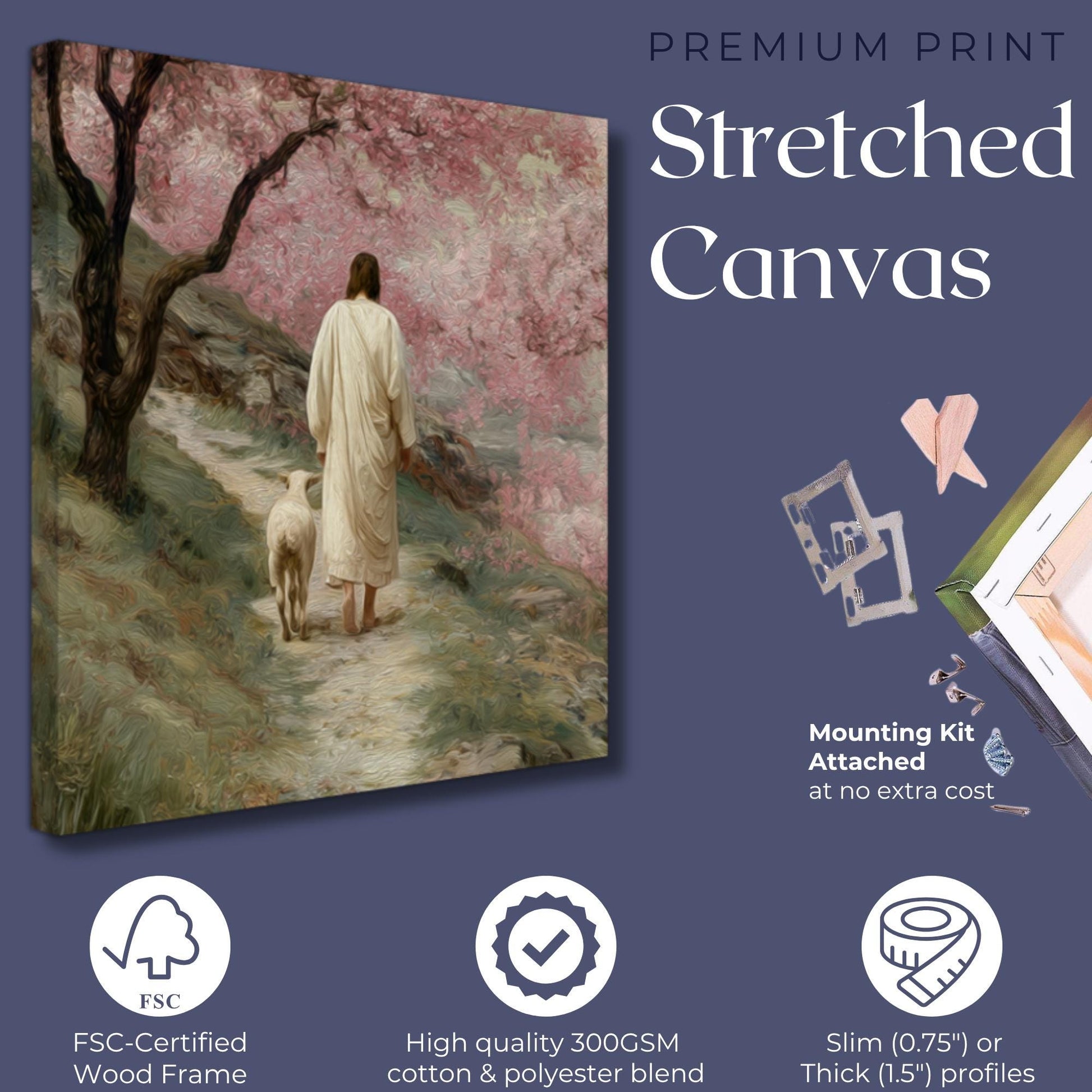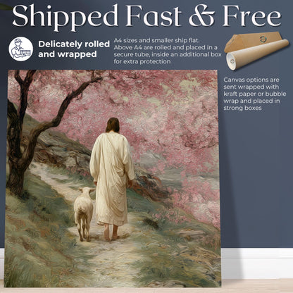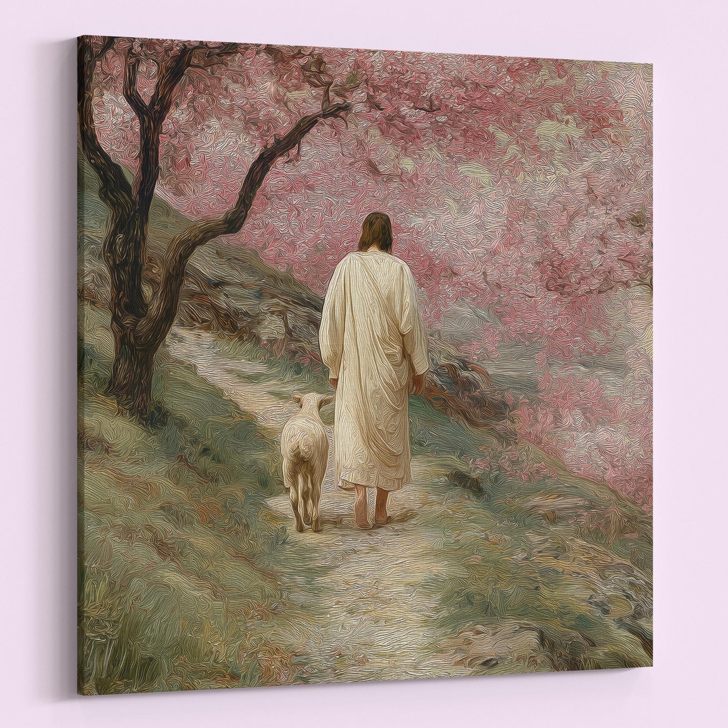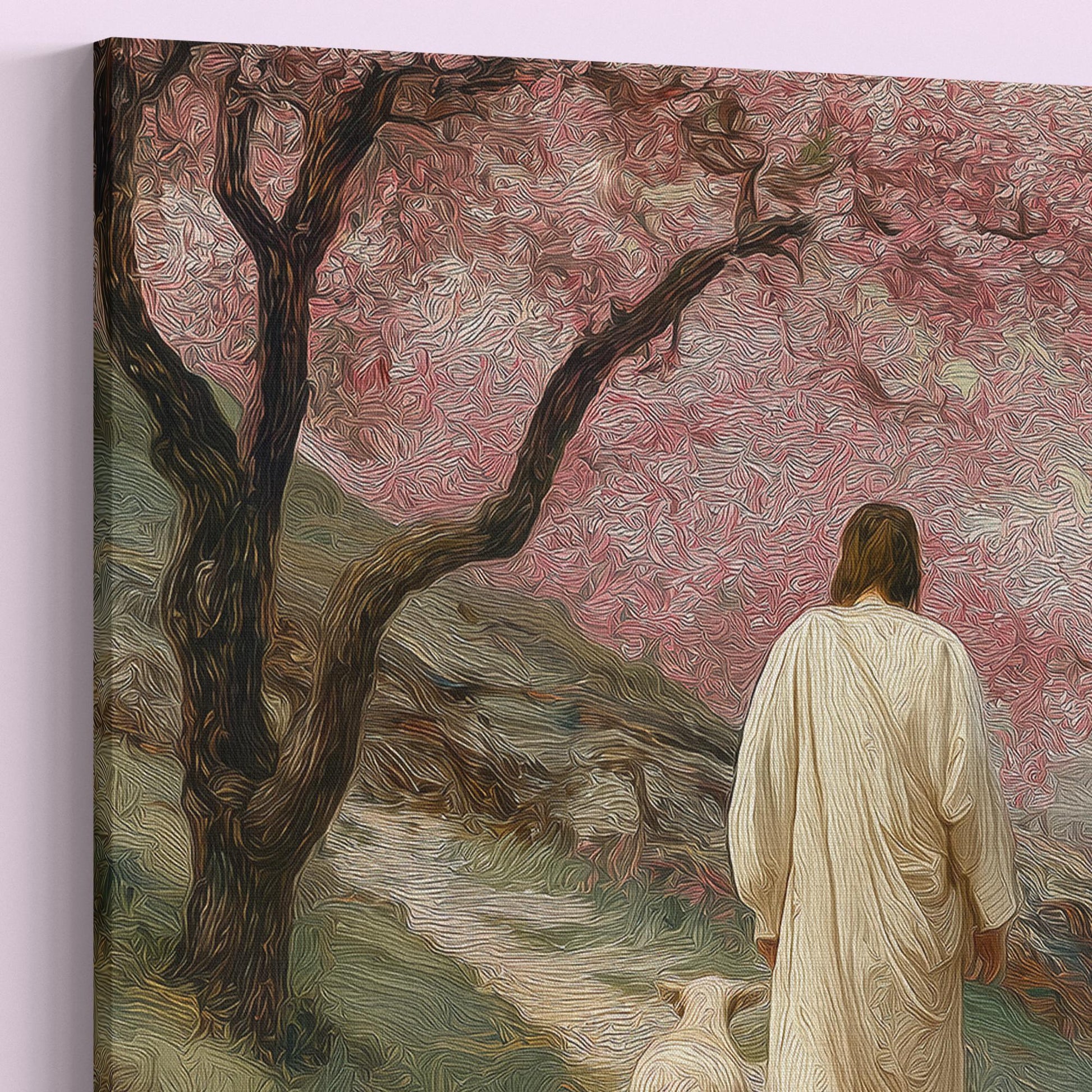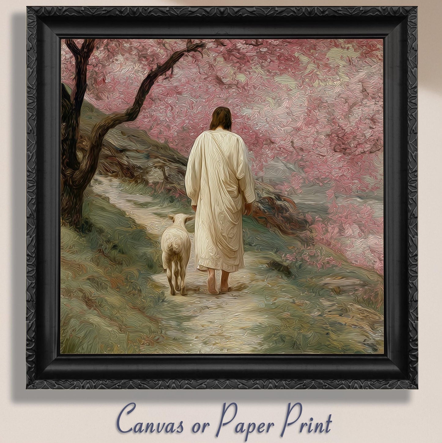 Artful Good Shepherd Canvas / Unframed. Jesus Leaving The 99 Print Cherry Blossom Path Christian Wall Art Lamb Painting Bible Verse Artwork