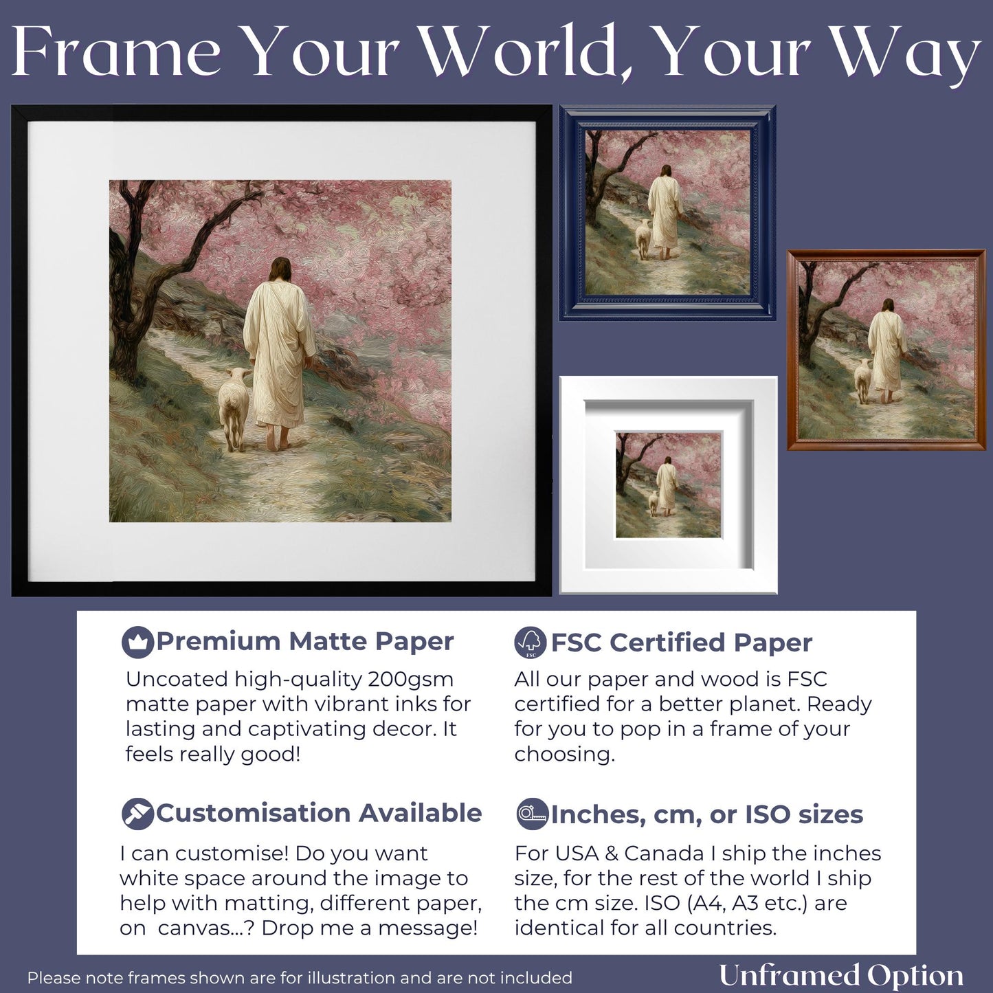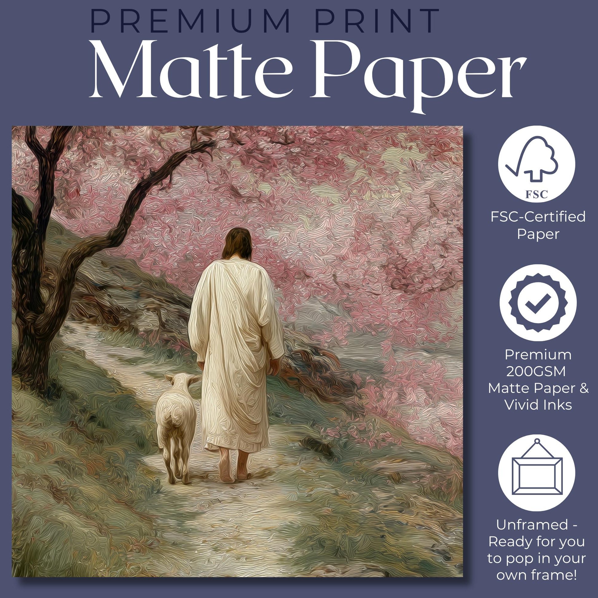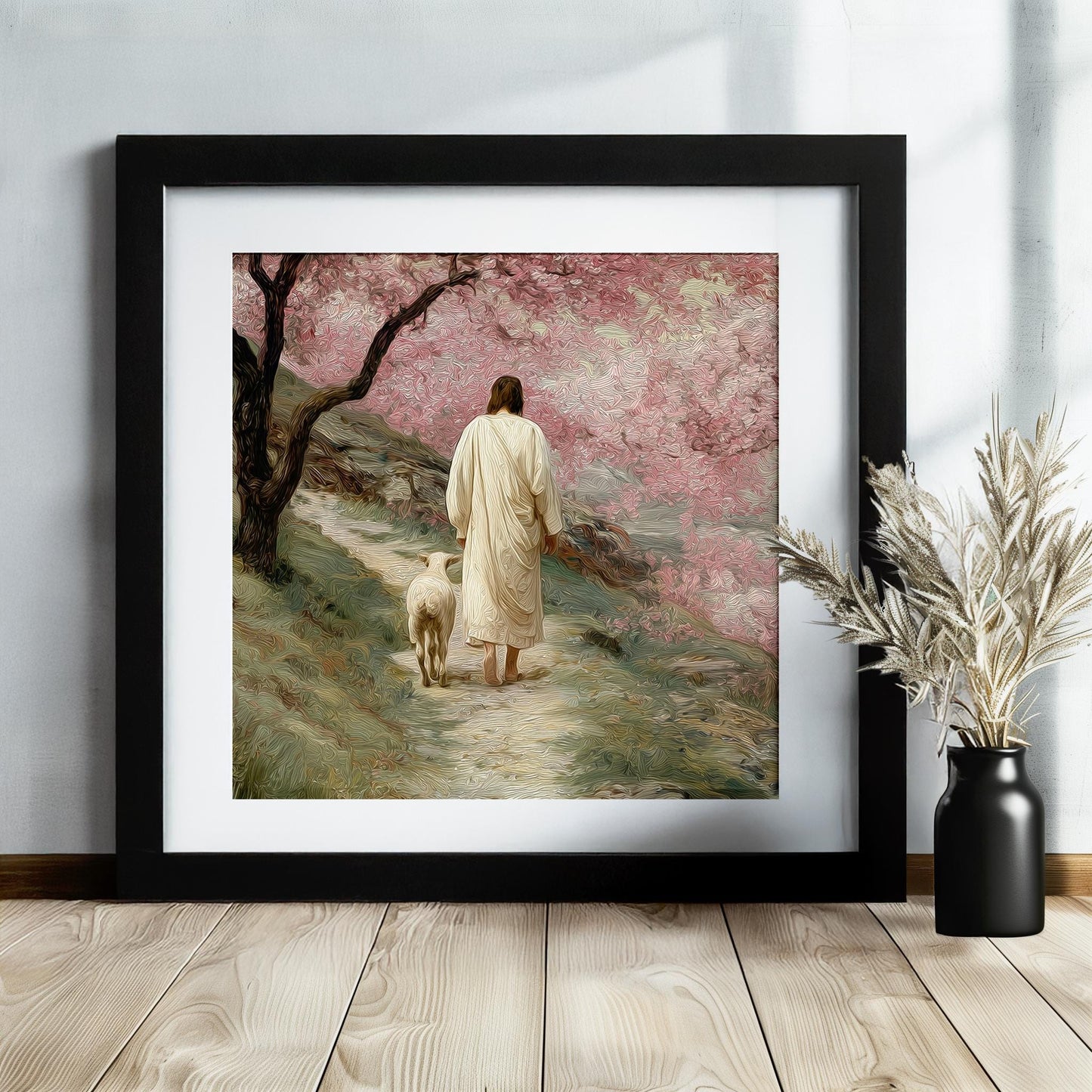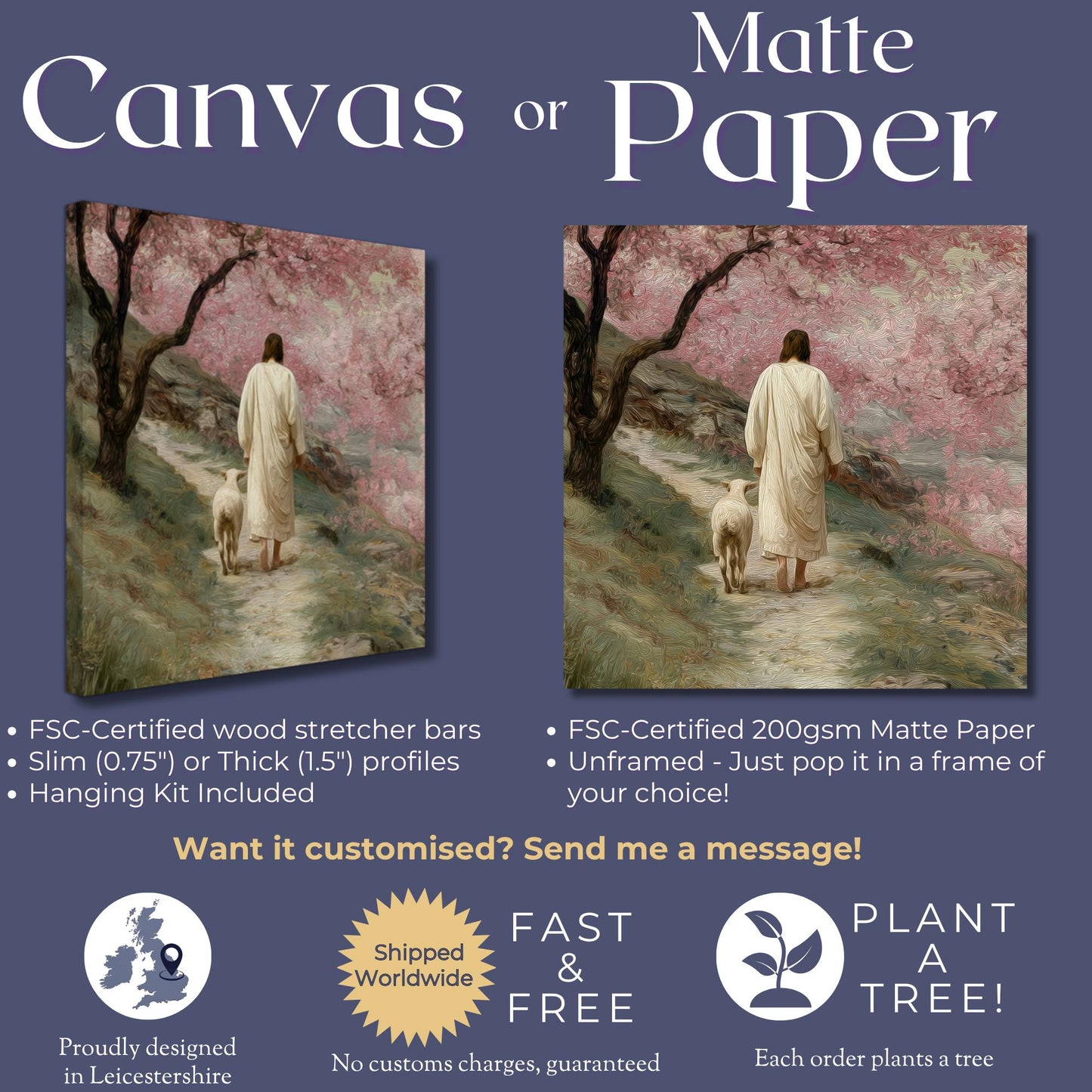 Artful Good Shepherd Canvas / Unframed. Jesus Leaving The 99 Print Cherry Blossom Path Christian Wall Art Lamb Painting Bible Verse Artwork