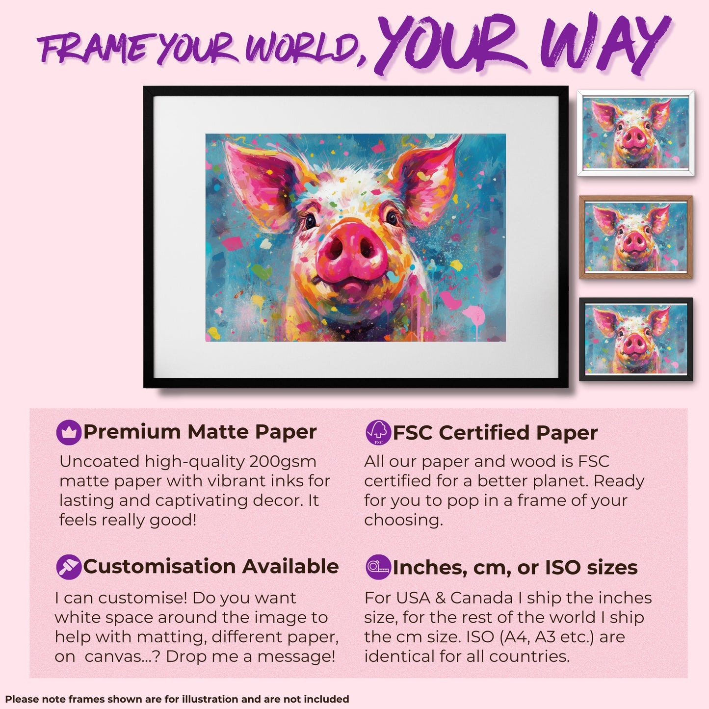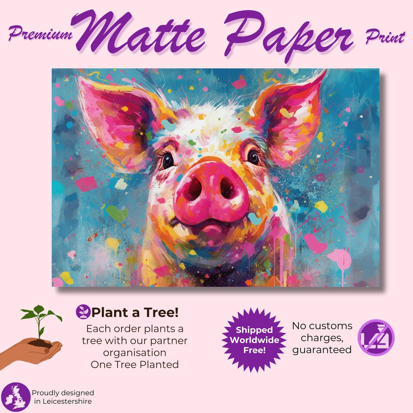 The colourful pig poster is printed on high-quality matte paper with sharp details. The paper is white, premium matte paper that has a natural, smooth uncoated finish that feels luxurious to the touch. The paper is 200 gsm/ 80 lb paper weight, which makes it durable and long-lasting. The paper is also FSC-certified or equivalent certifications depending on regional availability.