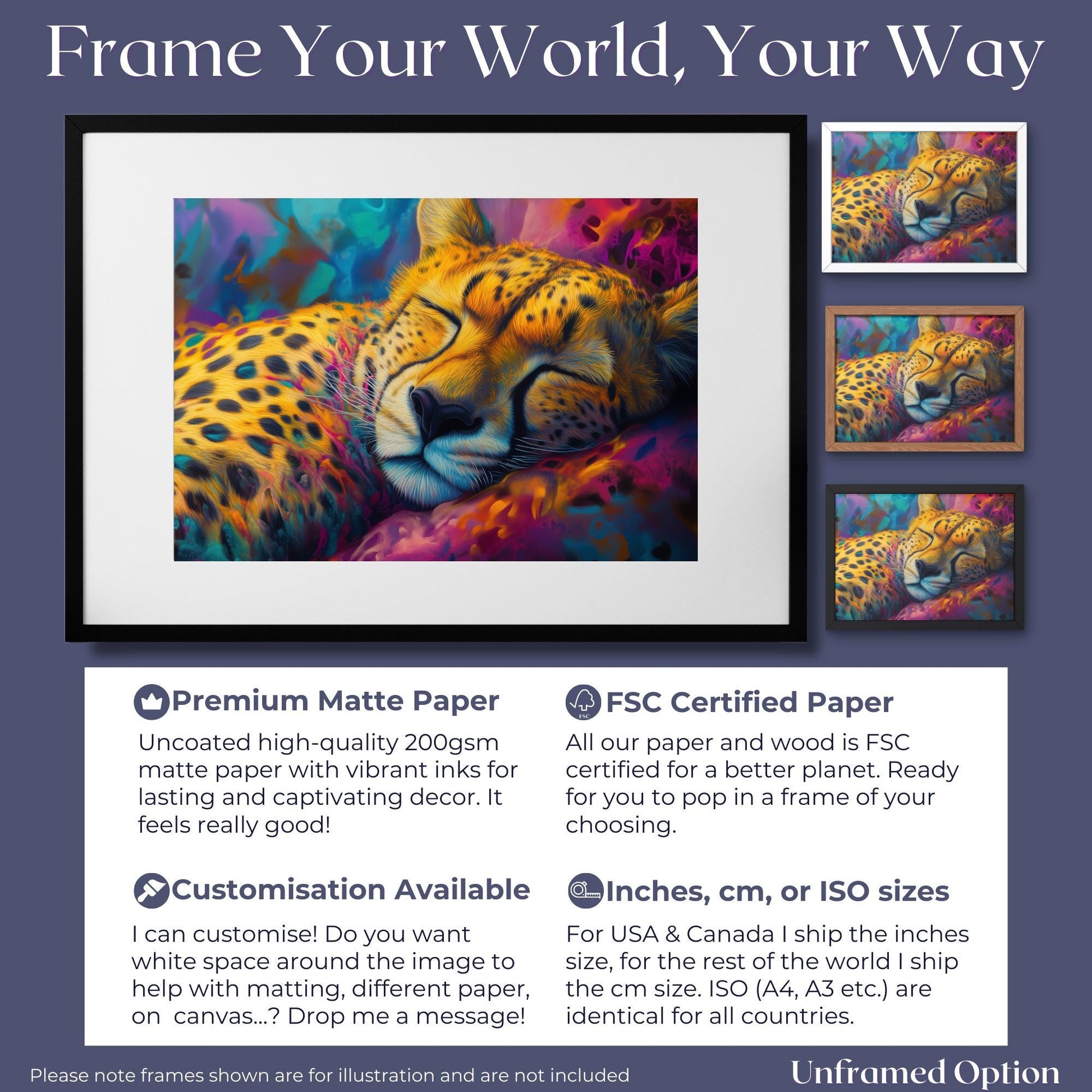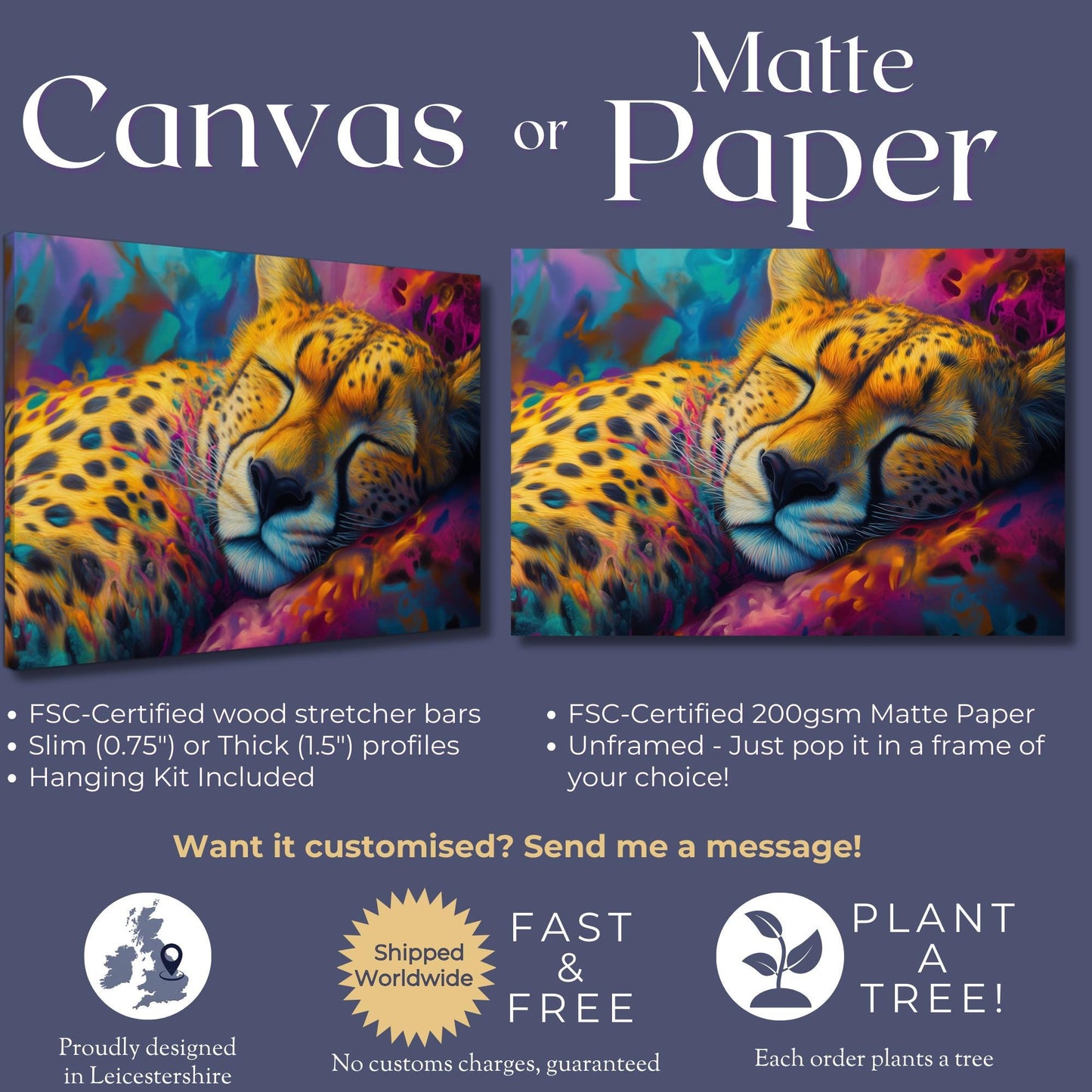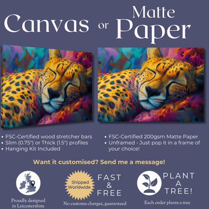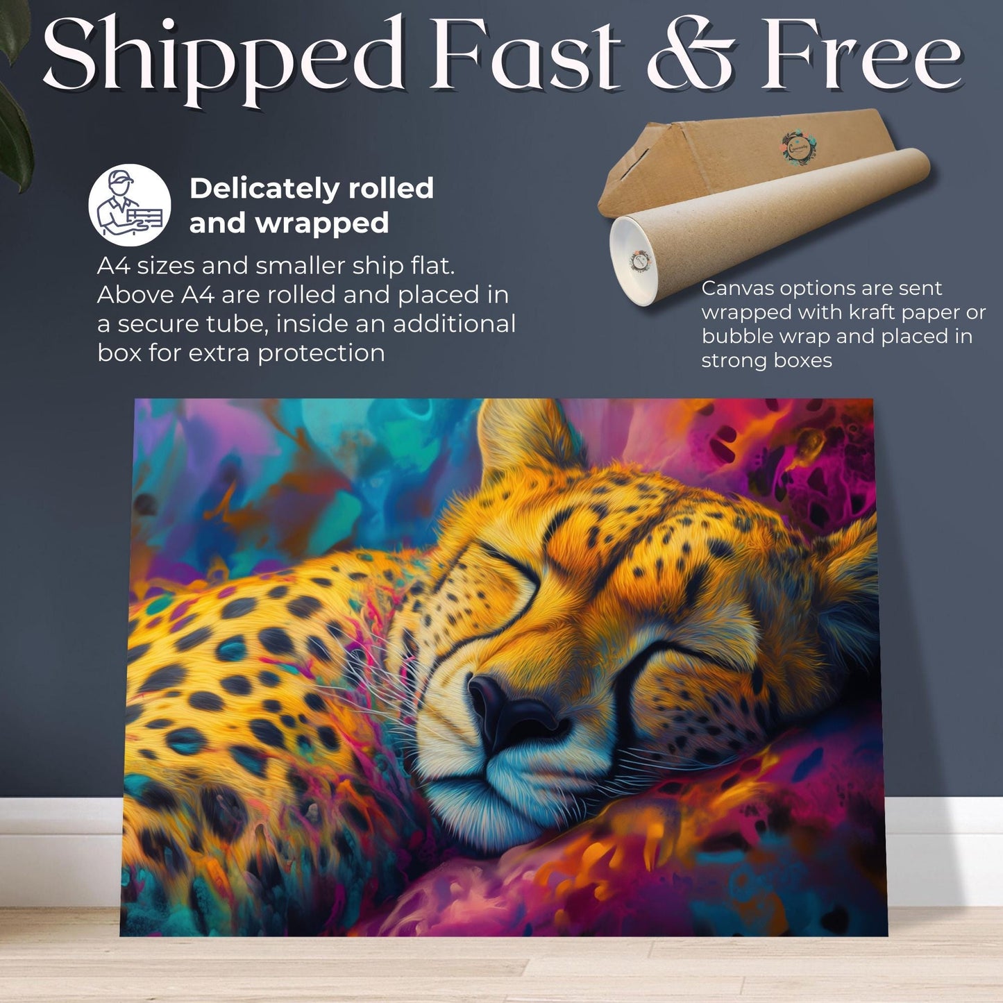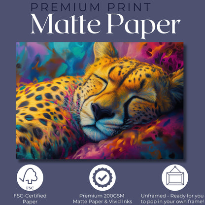 Order yours today and enjoy the serene yet vibrant beauty of this Colorful Sleeping Cheetah wall art!