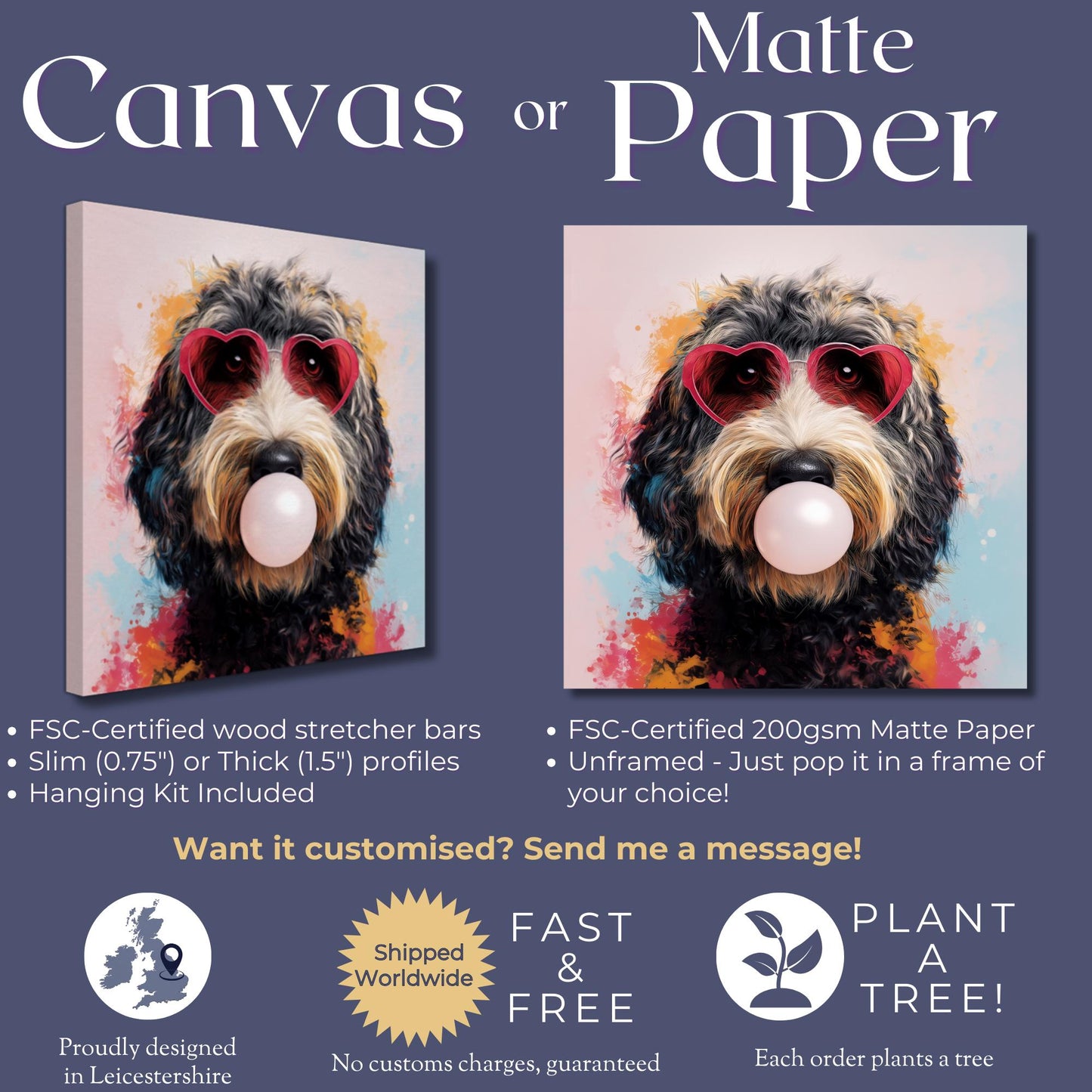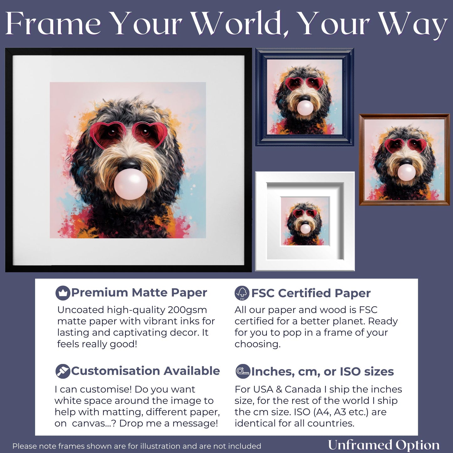 🐾 Our unframed option is printed on our premium 200gsm matte paper with fade resistant ink. It has a lovely texture and feel to it, and is packaged protectively so all you have to do is unwrap and pop it in a frame of your choice. Oh - and it's FSC-certified!