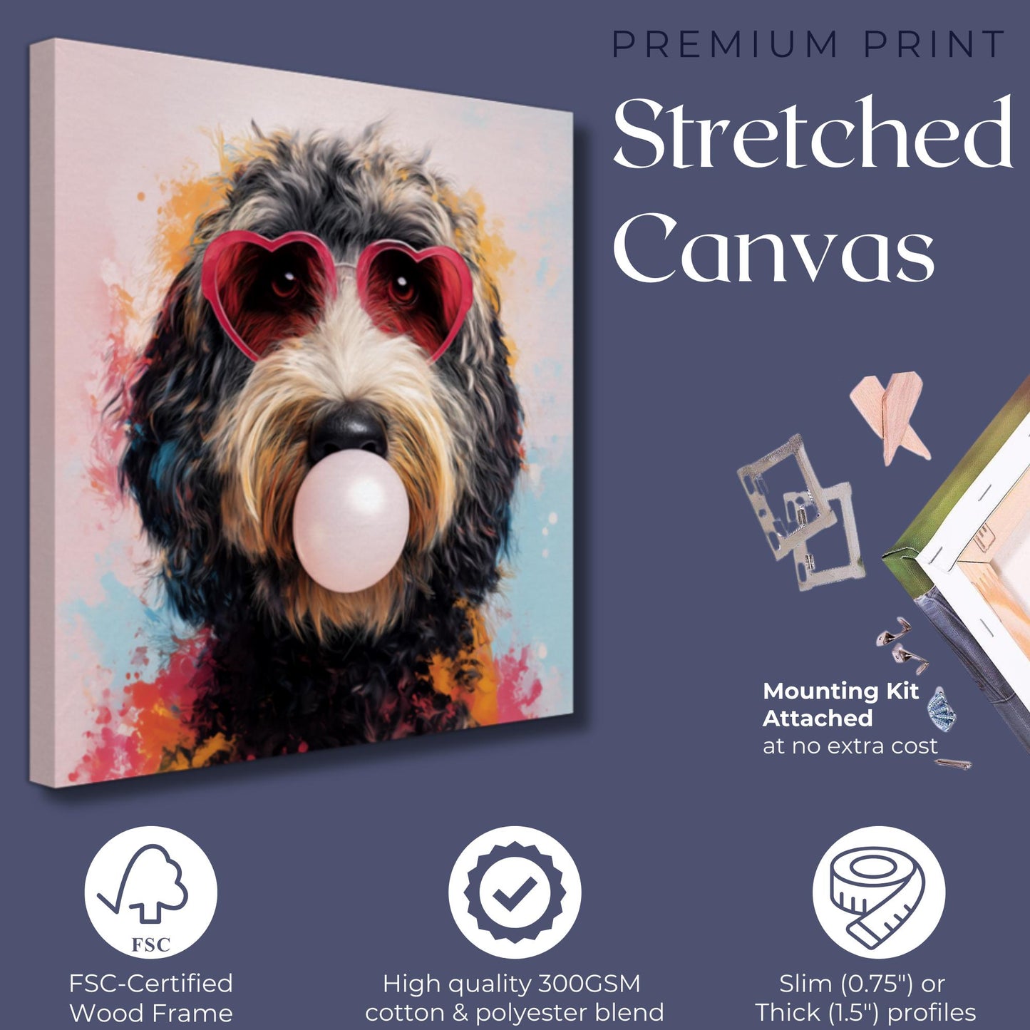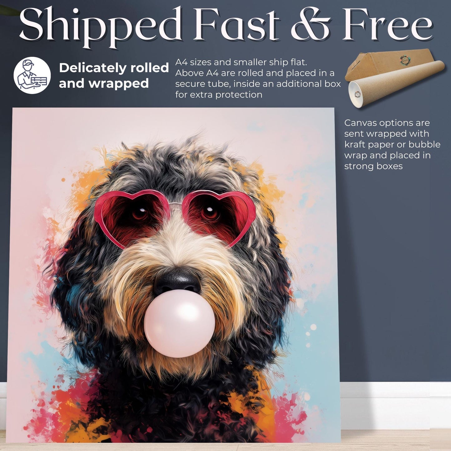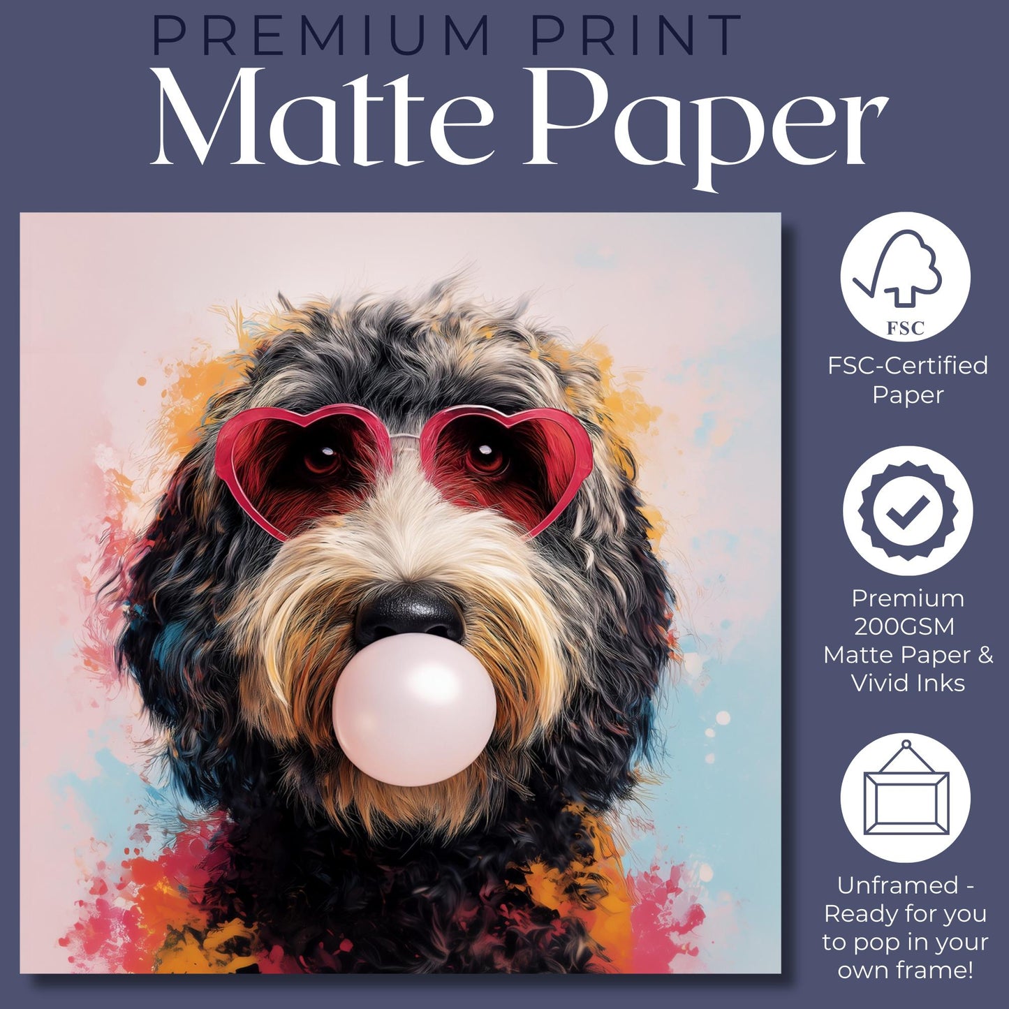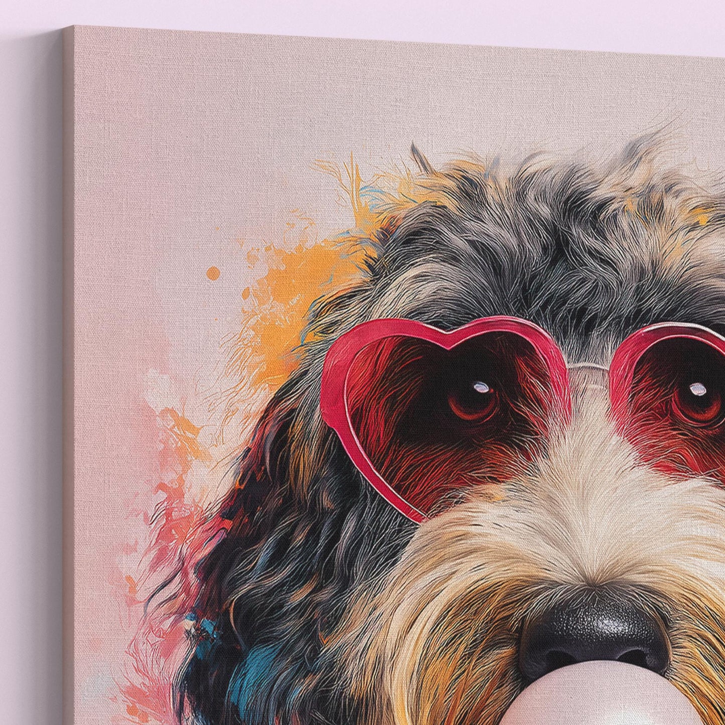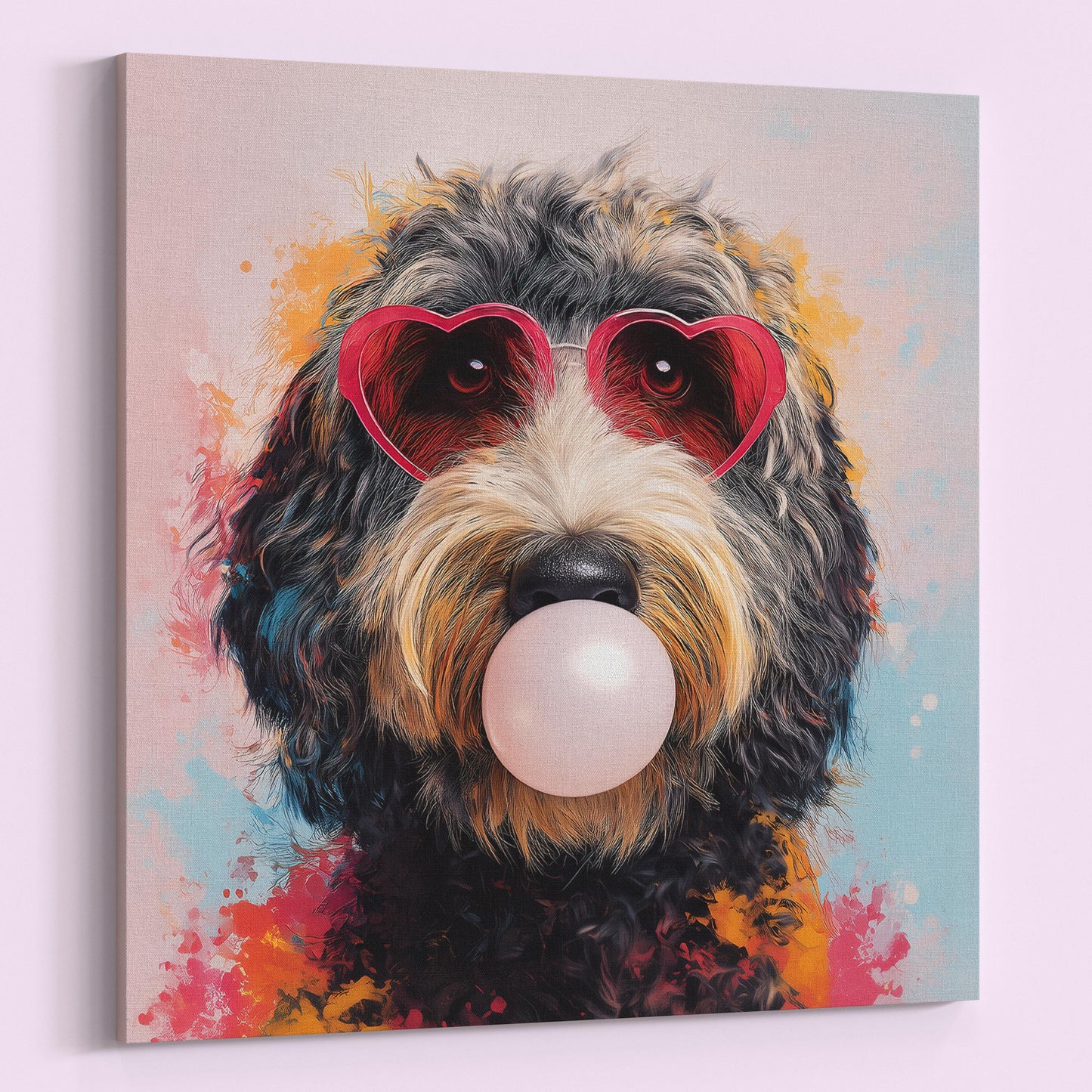 This funny dog print captures that perfect blend of whimsy and style with its vibrant pink background and adorable golden/apricot Goldendoodle/Labradoodle pup. The playful bubble gum bubble and heart-shaped glasses create an irresistible character that instantly brightens any room. This exclusive design can't be found anywhere else!