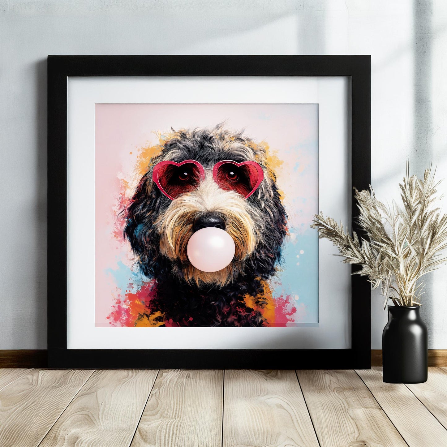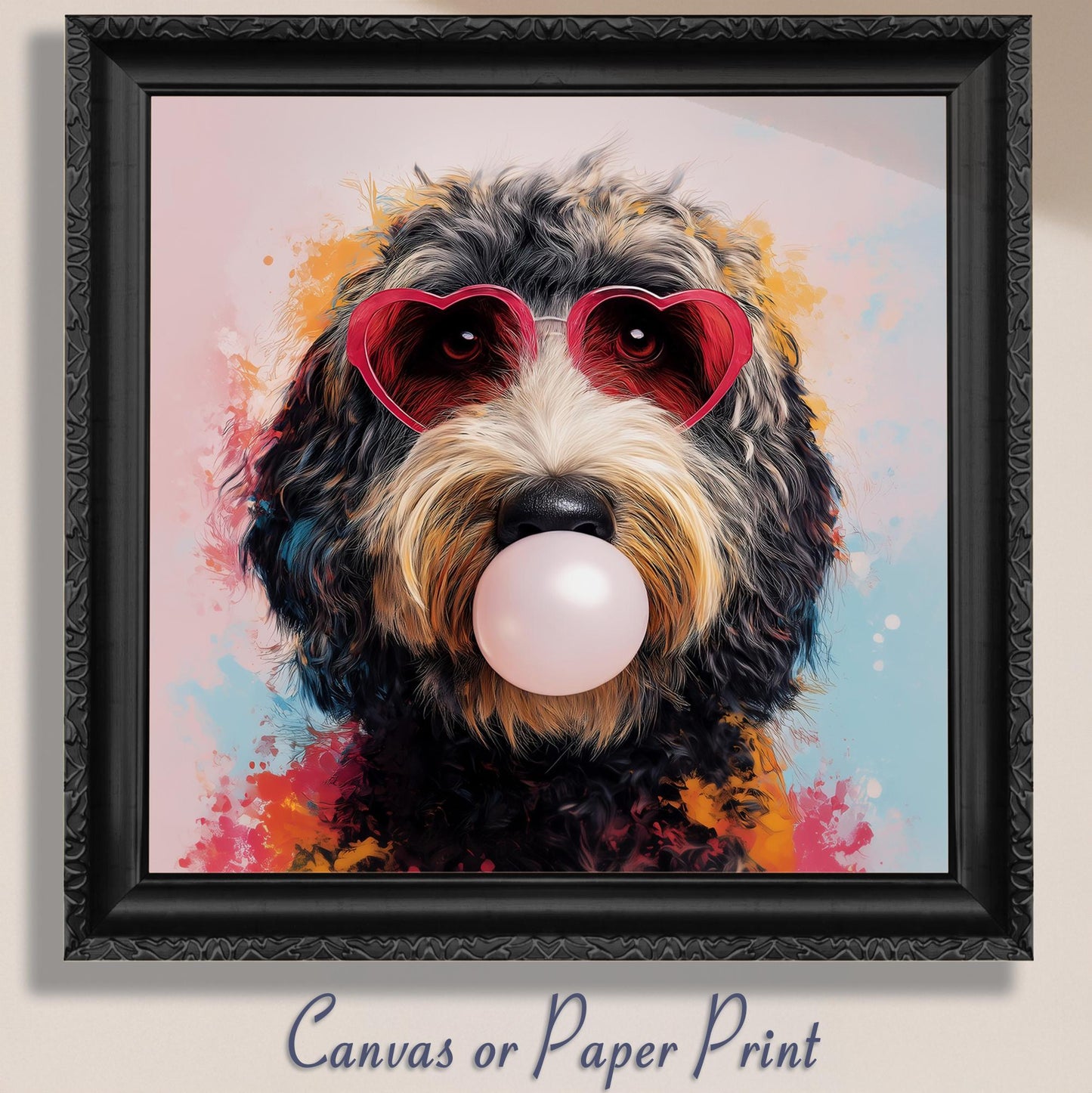 Brighten any space with this playful and adorable funny dog print featuring a golden/apricot doodle dog blowing bubble gum while rocking pink heart sunglasses! This exclusive design brings personality, charm, and a pop of pink to your walls - guaranteed to make everyone smile!