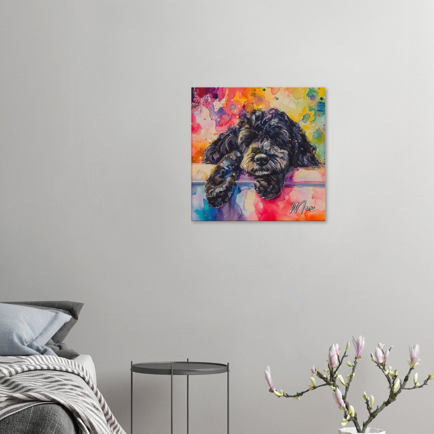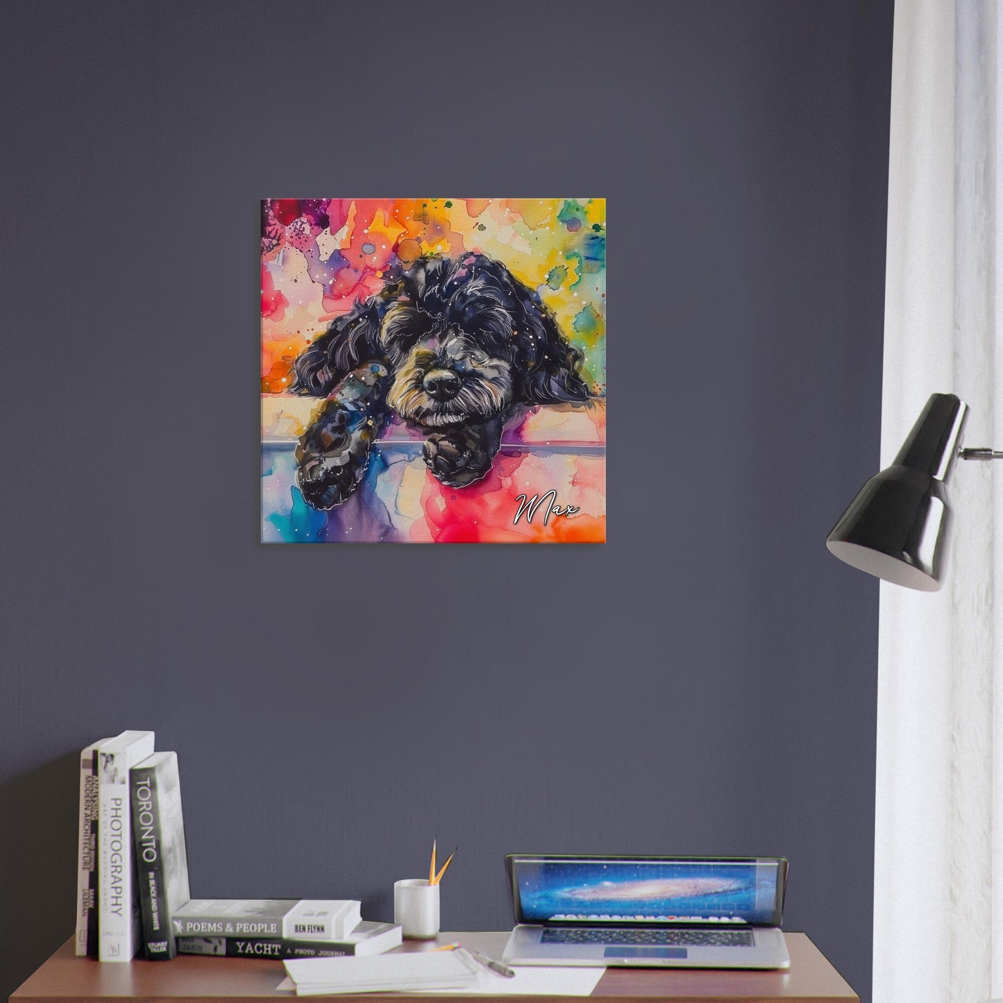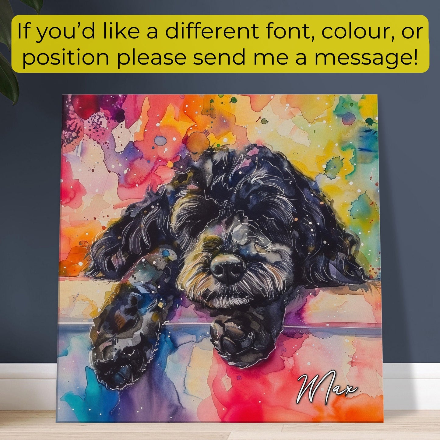 This cute little black Cockapoo is having a lovely nap catching some Z's on snooze, snore, repeat - that's the Doodle life (well, that and eating!) Illustrated in rainbow watercolour paint splashes on our premium personalised canvas this is sure to bring some pawsitivity to your space, whether you're looking to remember a beloved pet, celebrate their snores (or other windy escapes), or decorate your office or living room! 🐾