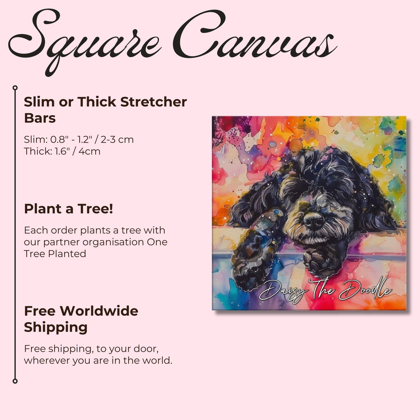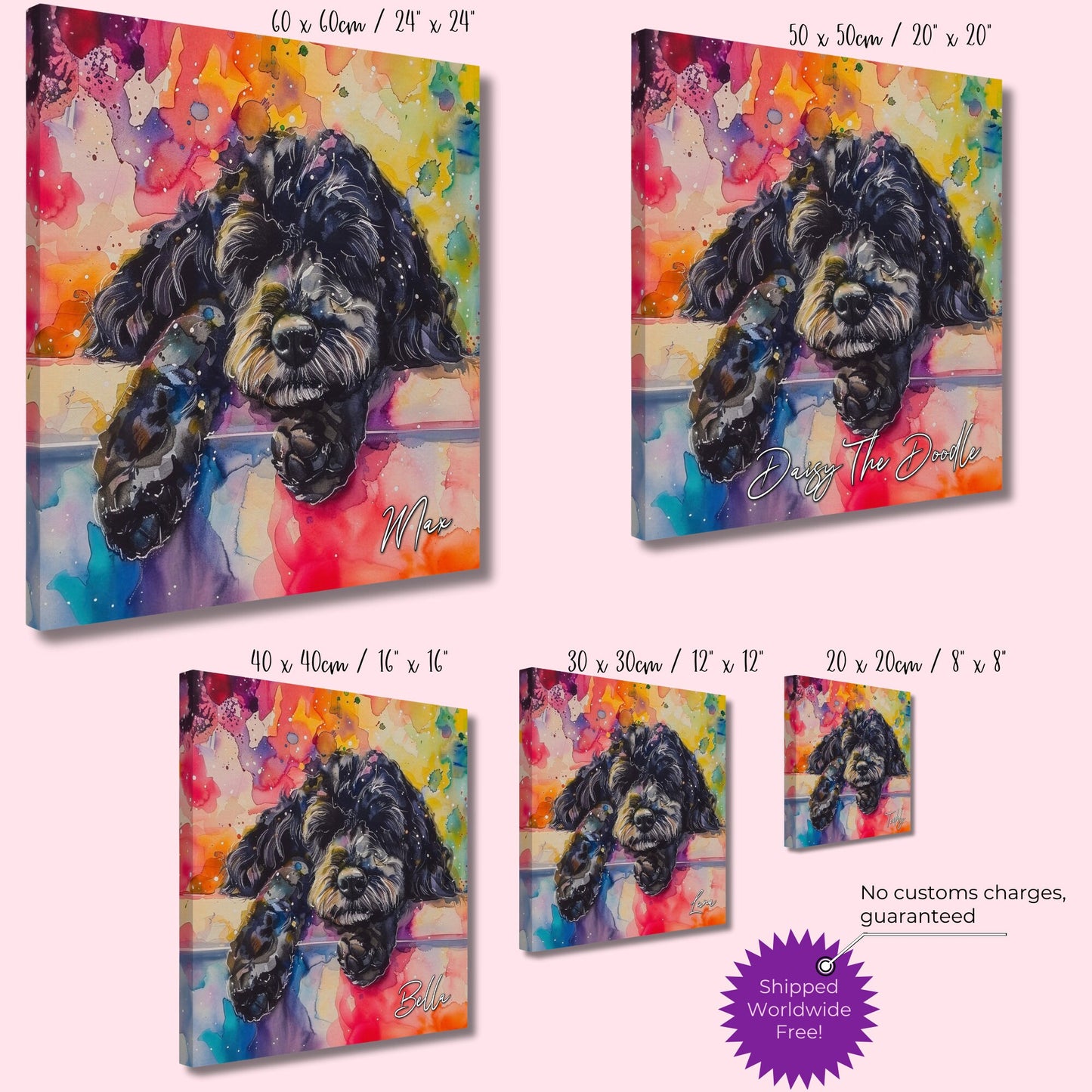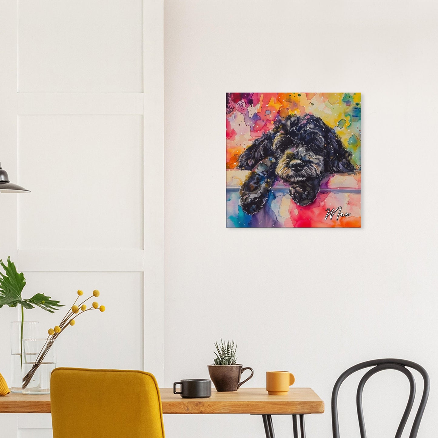 This cute little black Cockapoo is having a lovely nap catching some Z's on snooze, snore, repeat - that's the Doodle life (well, that and eating!) Illustrated in rainbow watercolour paint splashes on our premium personalised canvas this is sure to bring some pawsitivity to your space, whether you're looking to remember a beloved pet, celebrate their snores (or other windy escapes), or decorate your office or living room! 🐾