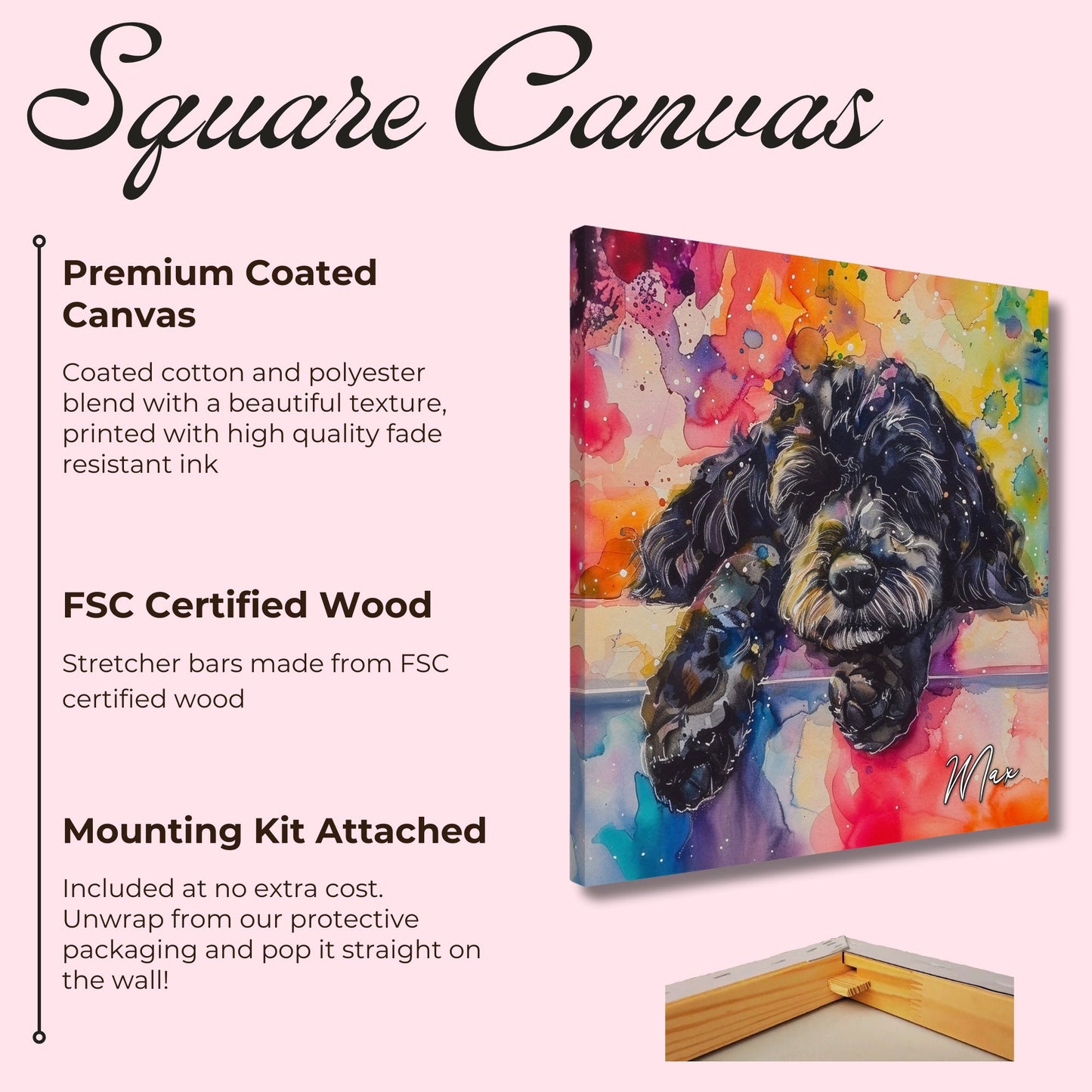 This paint splash watercolour canvas print features a napping black Cockapoo (Cocker Spaniel Poodle Cross) illustrated in splashes of colour. Printed on our premium canvas and stretched over an FSC certified wooden frame - ready to hang, this cute Doodle Dog painting will add a splash of sweetness to any room. The canvas has a lovely texture and robust design, and our ink is vibrant and long lasting so this will continue to look great in your space for years to come🙂