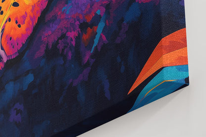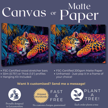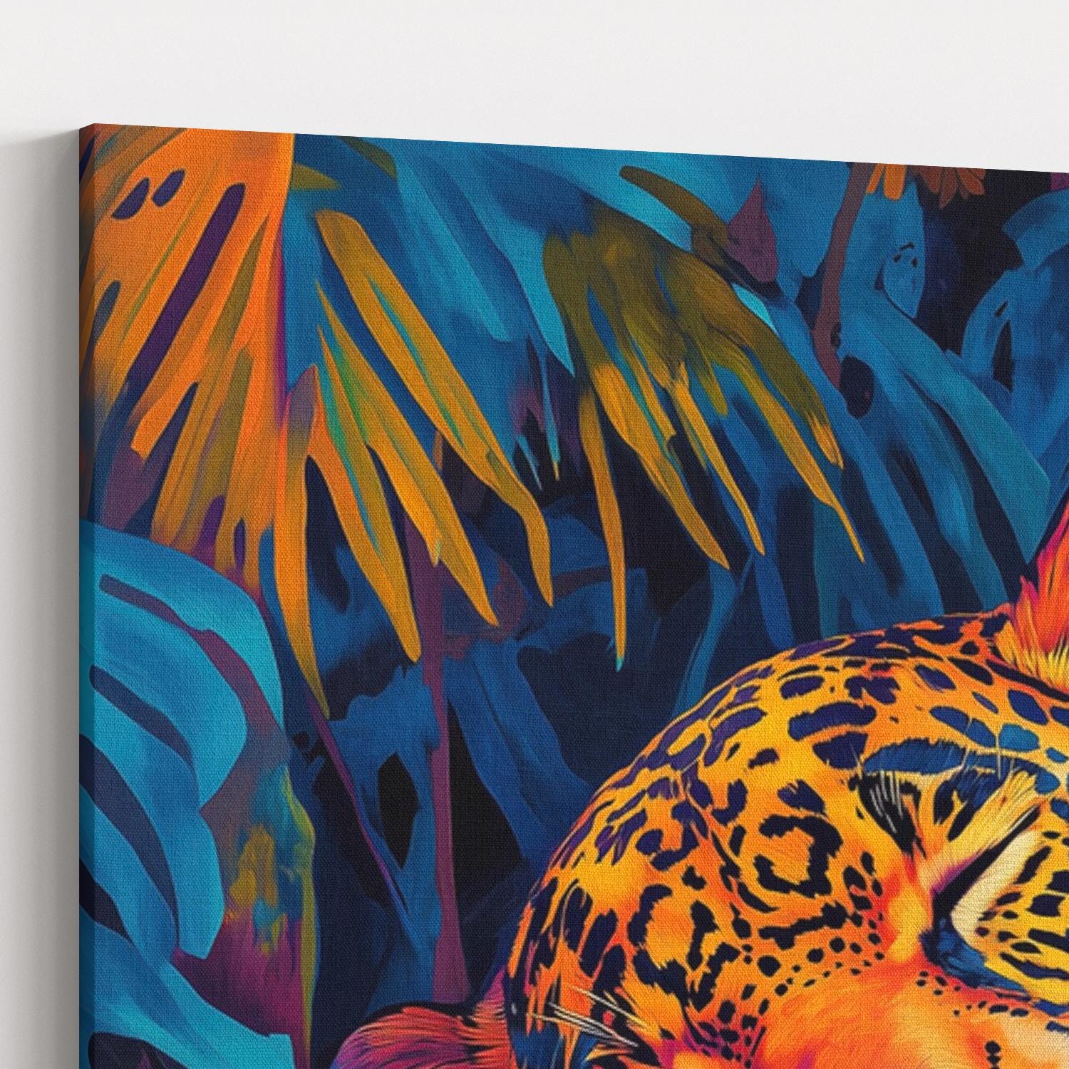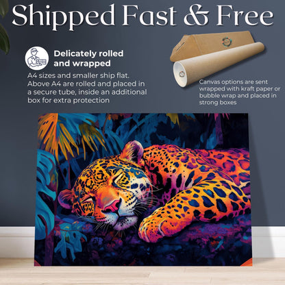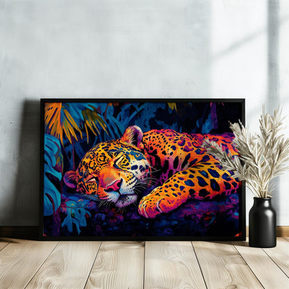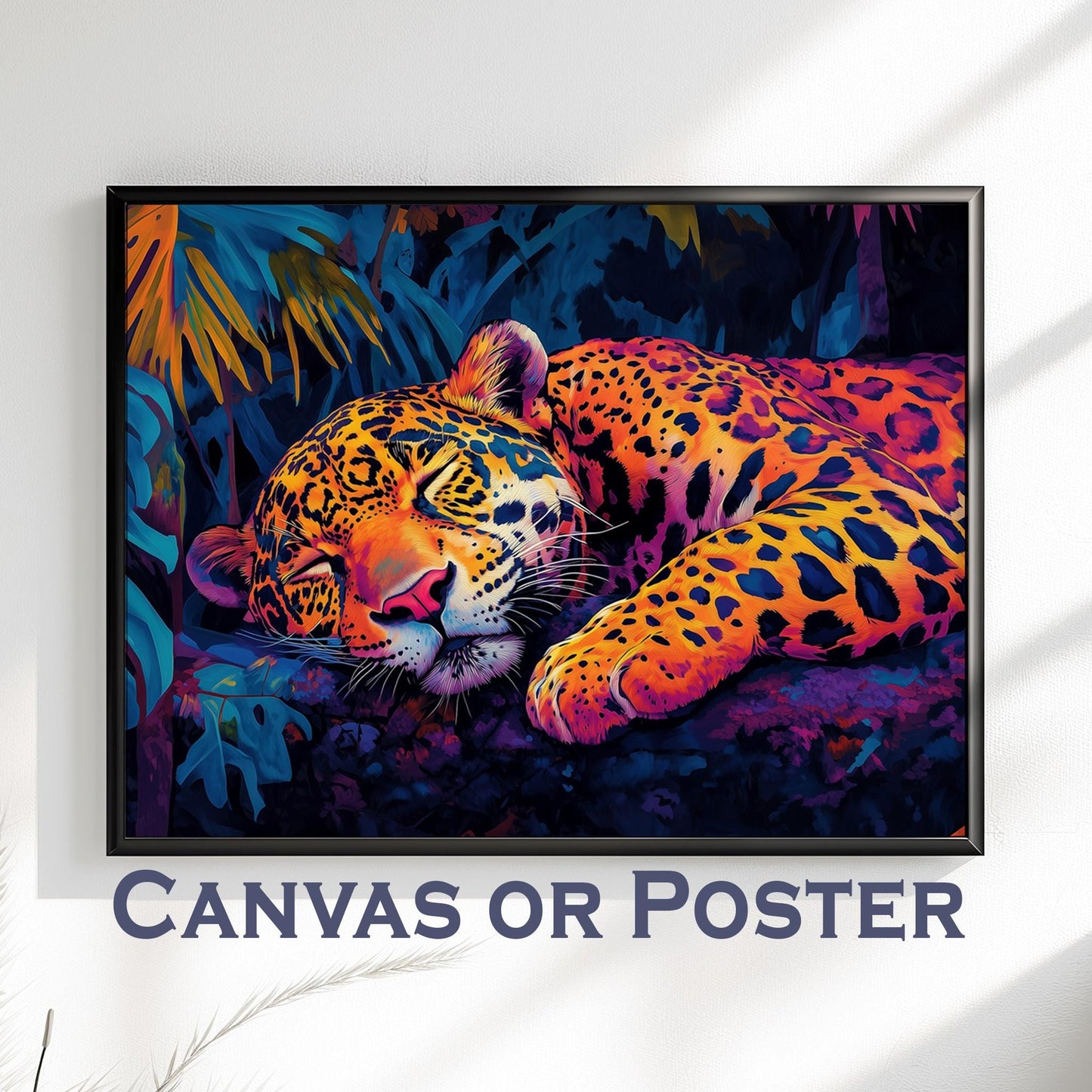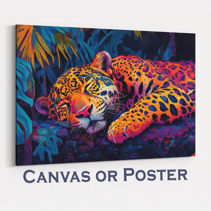 This striking art piece features a peacefully sleeping leopard in vibrant neon colors, surrounded by tropical foliage in rich teals, yellows, and magentas. The colorful, contemporary design combines the majesty of wildlife with bold, modern colors creating a statement piece that brings energy and exotic beauty to any room. The teal and magenta accents give this jungle cat artwork a unique, contemporary feel that stands out from traditional wildlife art.
