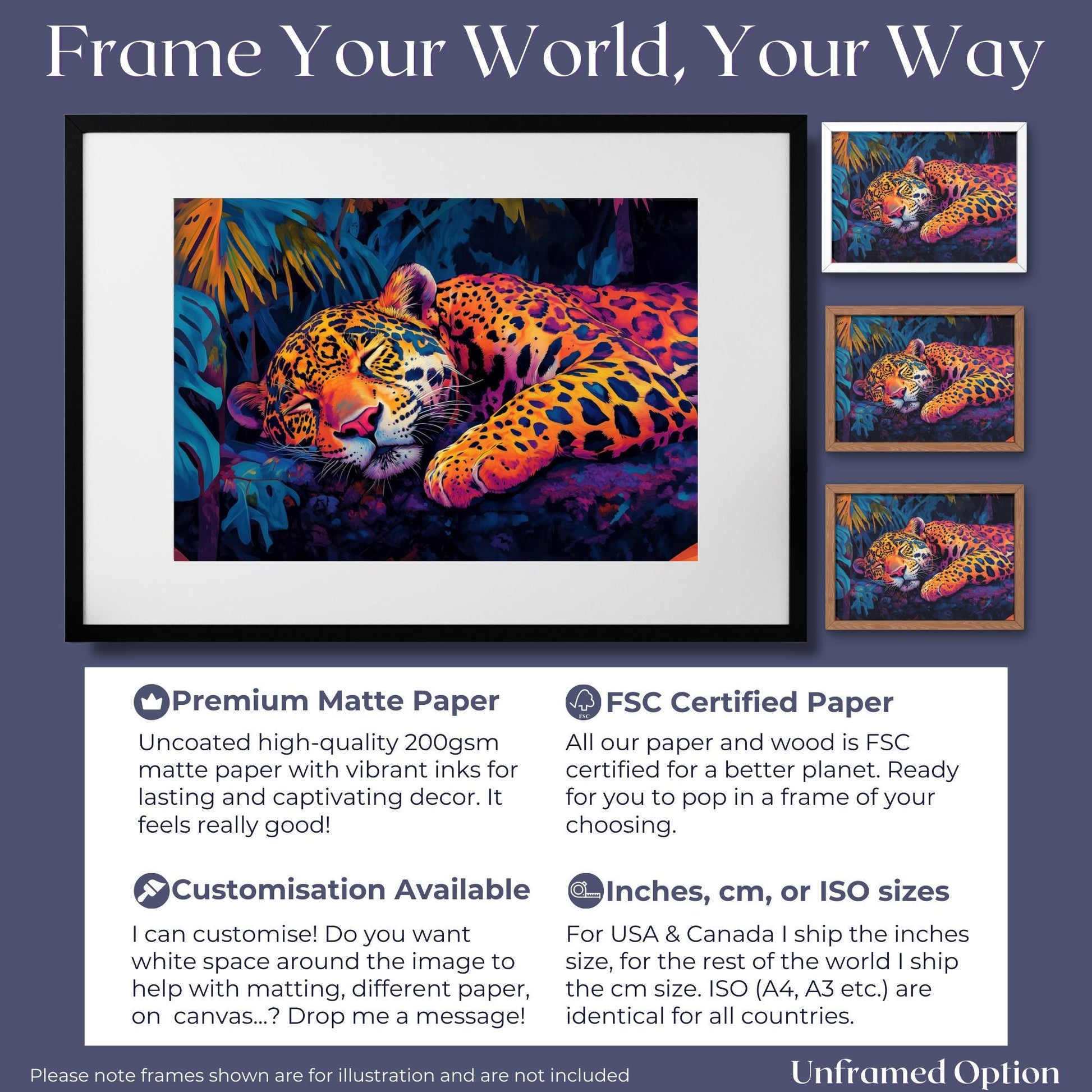 🐆 Our unframed options are printed on our premium 200gsm matte paper with fade resistant ink. It has a lovely texture and feel to it, and is packaged protectively so all you have to do is unwrap and pop it in a frame of your choice. Oh - and it's FSC-certified!
