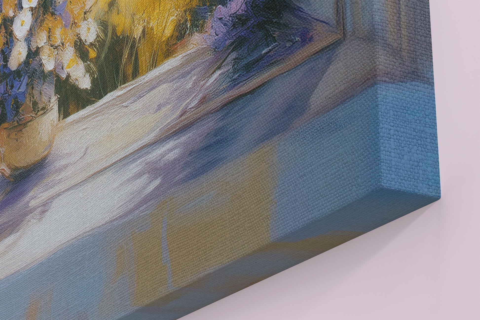 The open window illusion combined with the delicate wildflower arrangement and serene beach scenery creates an emotional connection that transports you instantly to your favorite coastal getaway. The color palette of turquoise blues, soft purples, creamy whites, and golden sandy tones perfectly captures the light and atmosphere of a sunny beach day and complements a wide range of interior styles while adding a refreshing touch of coastal elegance.
